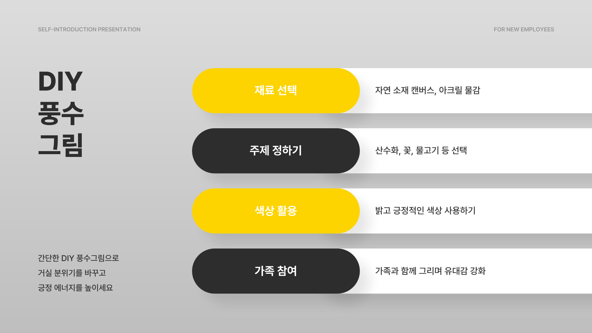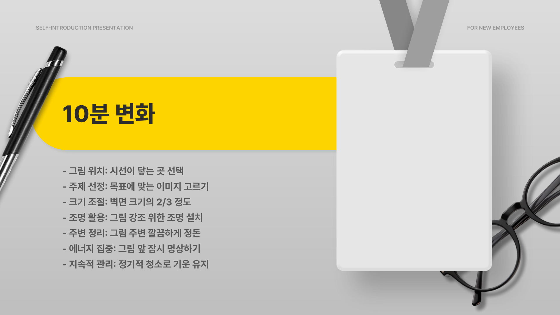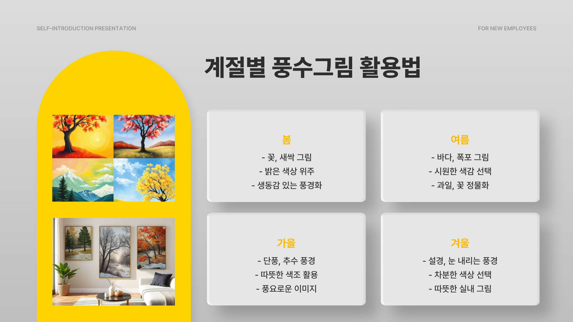 - 주제: 자연, 인물, 추상 등 개인의 취향 반영