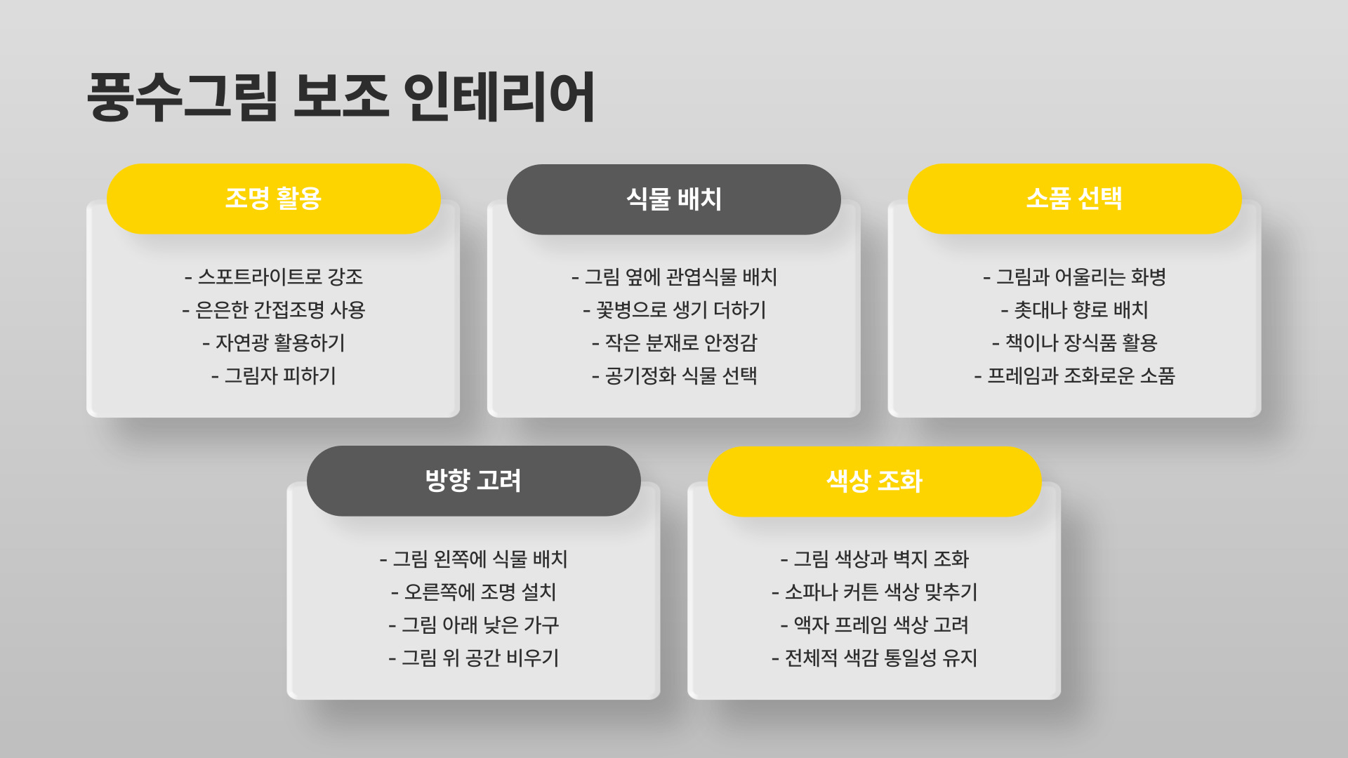 이처럼 간단하지만 효과적인 거실풍수그림 활용법을 통해 여러분의 거실을 더욱 쾌적하고 아름답게 변화시킬 수 있습니다. 꼭 한번 시도해 보시고, 긍정적인 에너지를 집 안 가득 느껴보시길 바랍니다!