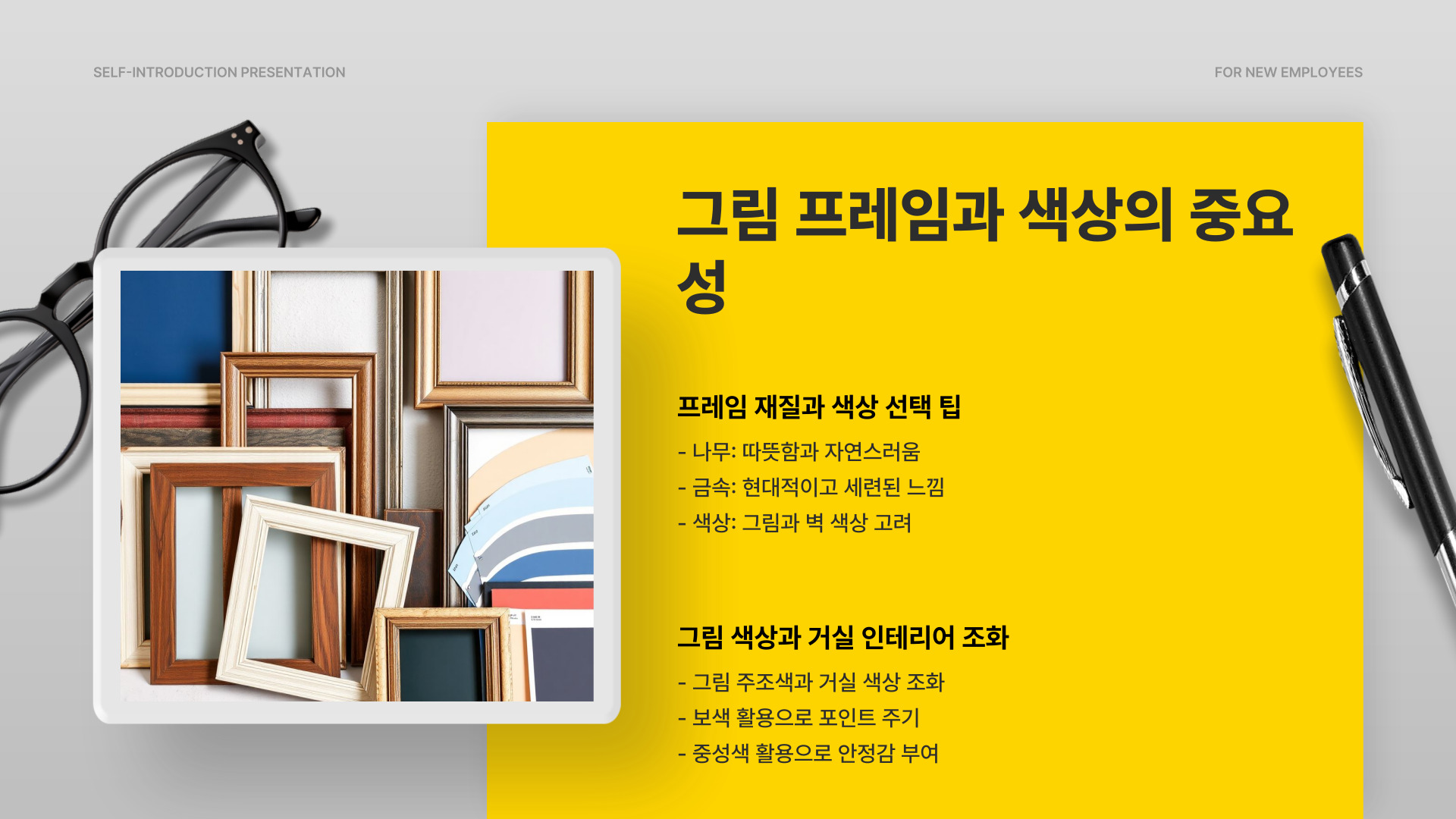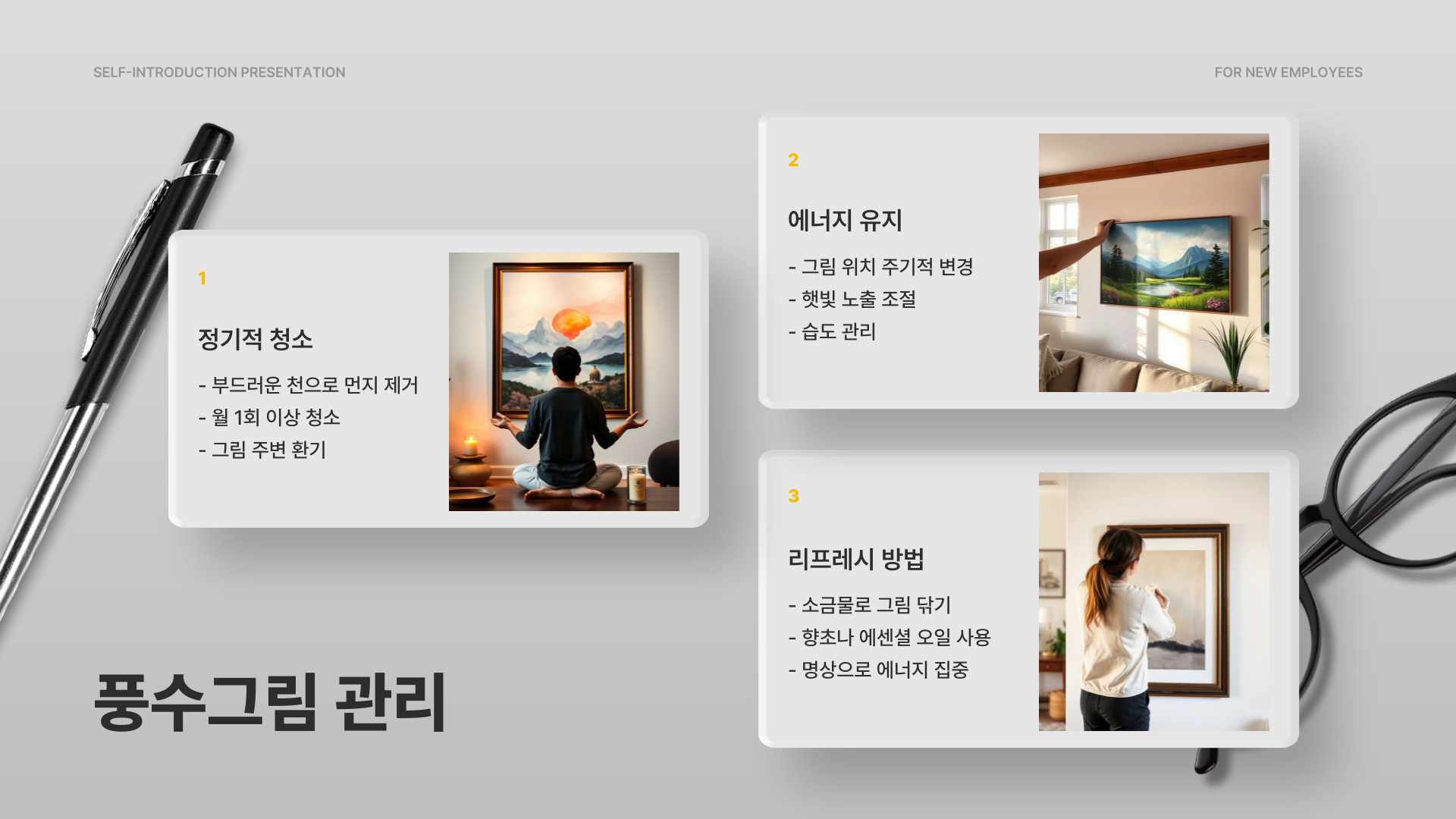 - 주제: 자연, 인물, 추상 등 개인의 취향 반영