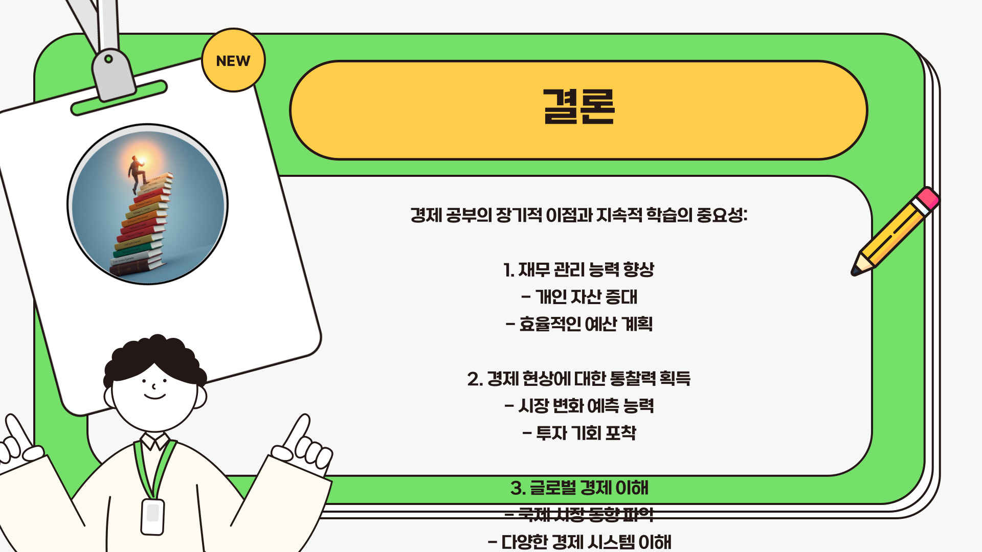 마지막으로, 경제 공부에 투자하는 것은 개인의 성장을 위한 초석이 될 수 있습니다. 경제적 지식을 갖춘 사람들은 사회의 여러 측면에서 더 나은 의사 결정을 할 수 있으며, 성공적인 경력을 쌓는 데 있어 유리합니다. 지식을 바탕으로 한 자신감은 보다 명확하고 효과적인 대인 관계를 형성하는 데 도움을 줄 것입니다.