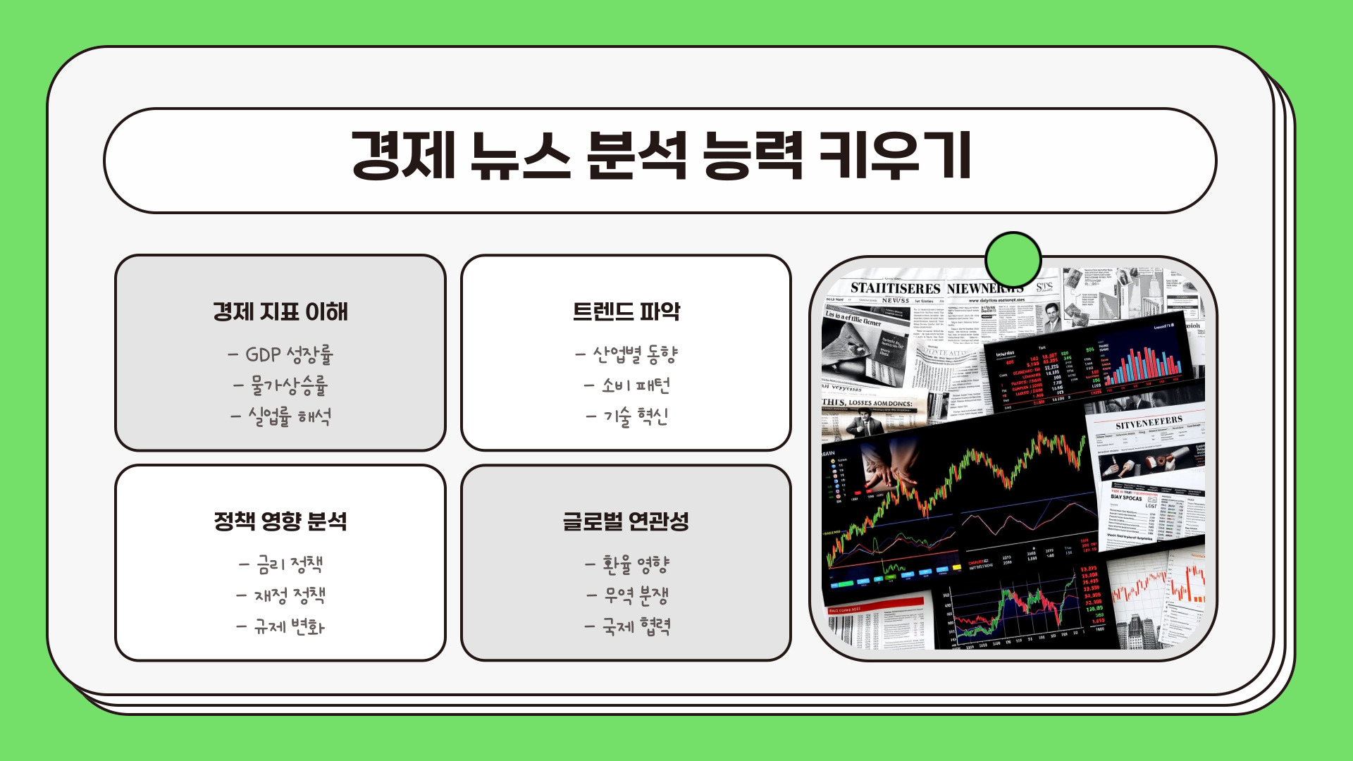 둘째, 차트를 보고 이해력을 높이는 방법도 있습니다. 차트와 그래프는 경제적 데이터를 시각적으로 보여주기 때문에 복잡한 통계를 쉽게 파악할 수 있게 해줍니다. 데이터에 기반한 결정을 내리기 위해서는 이러한 시각 자료를 해석하는 능력이 중요합니다. 예를 들어, 전체 시장 추세를 이해하기 위해 주가 차트를 항상 확인하는 것은 유용한 습관입니다.