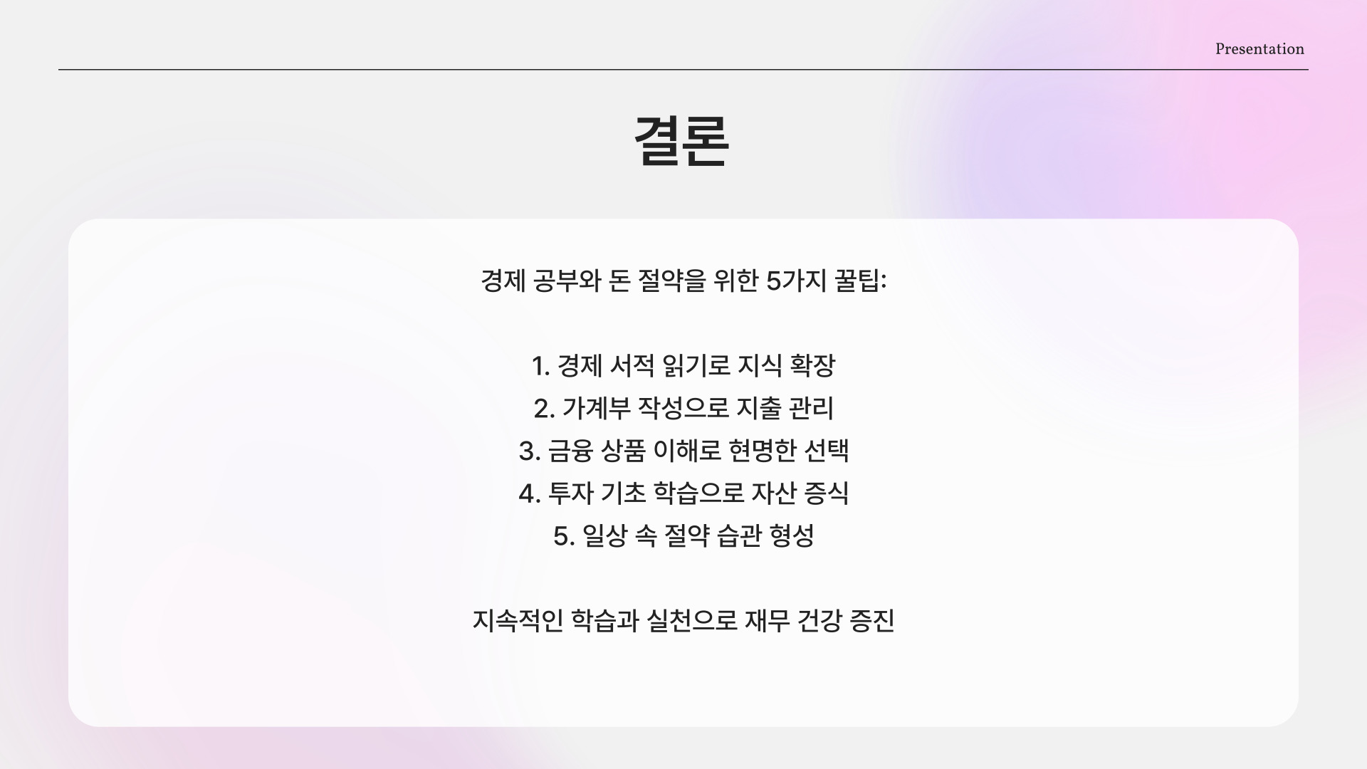 이상으로 경제 공부를 통해 돈을 절약할 수 있는 다섯 가지 꿀팁을 살펴보았습니다. 각 팁을 생활 속에서 실천하며, 지속적으로 개선하고 발전시킨다면, 재정적 안정과 더 나아가 재정적 자유를 이룰 수 있을 것입니다. 경제 공부는 여러분의 미래를 위한 가장 중요한 투자임을 잊지 마세요!