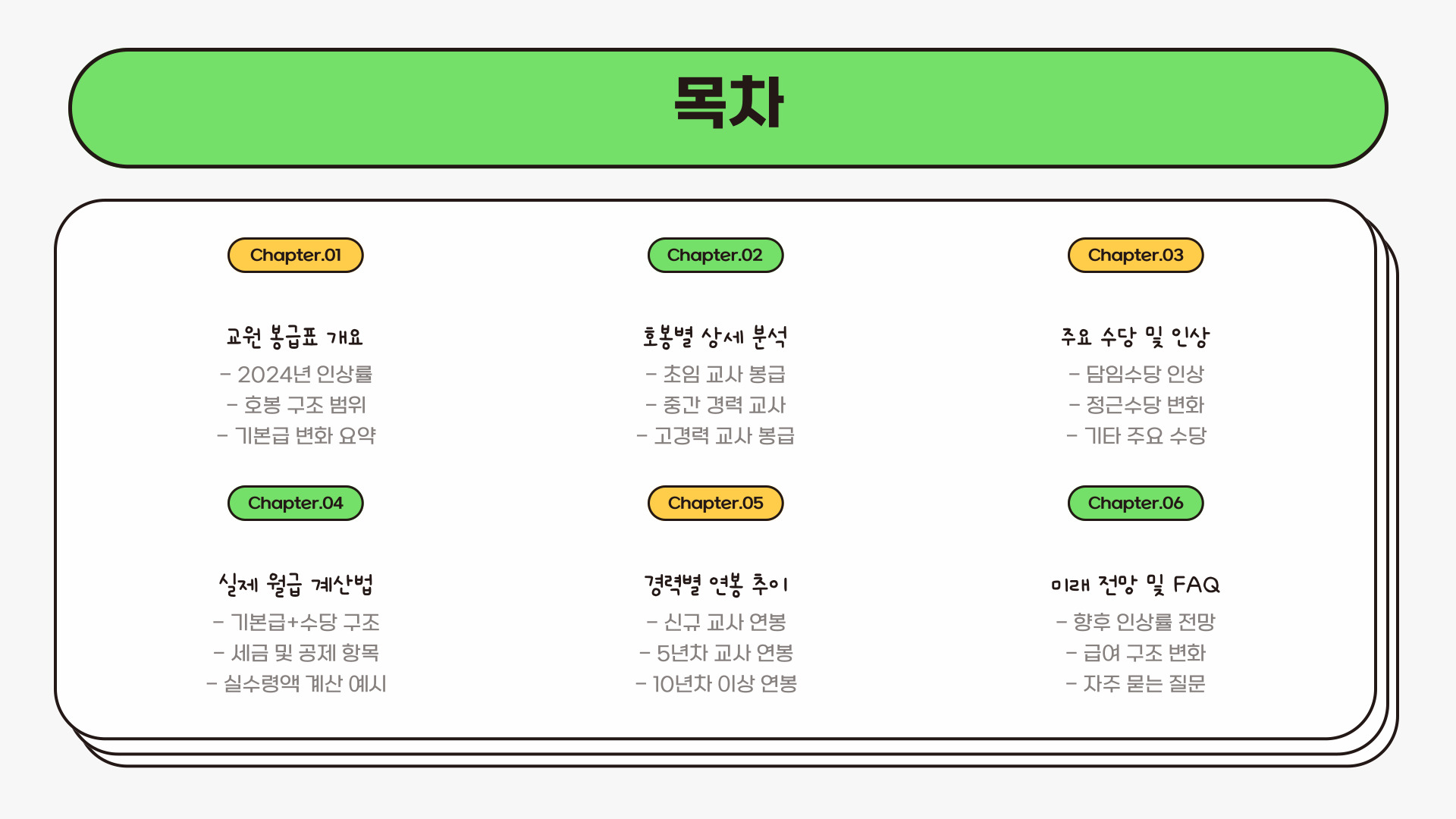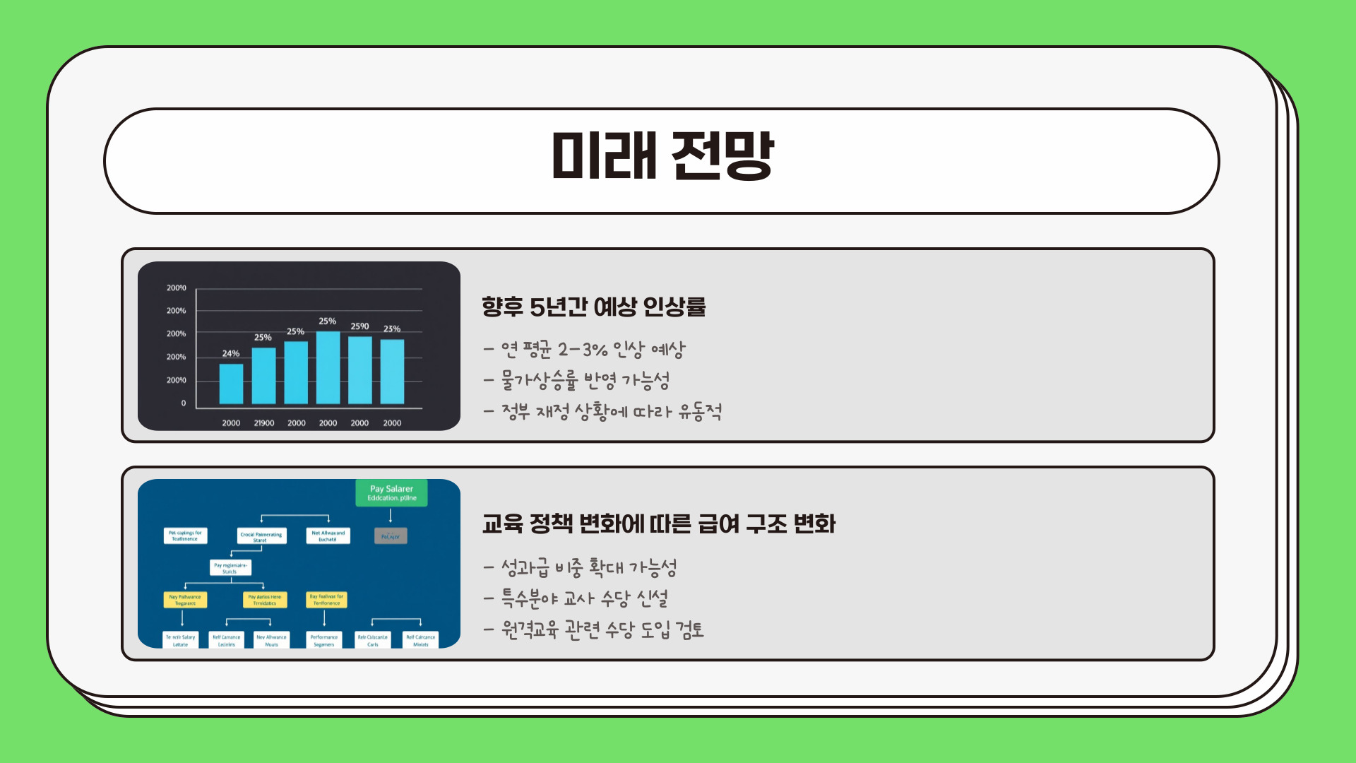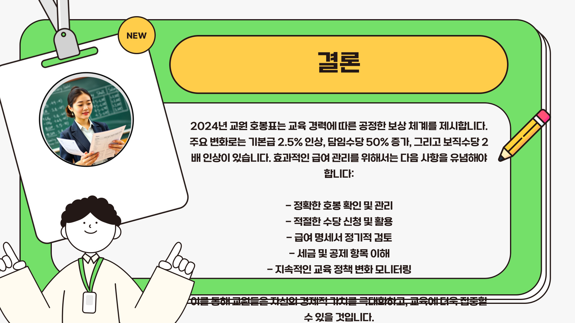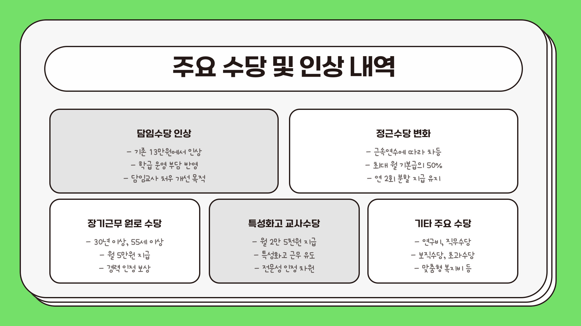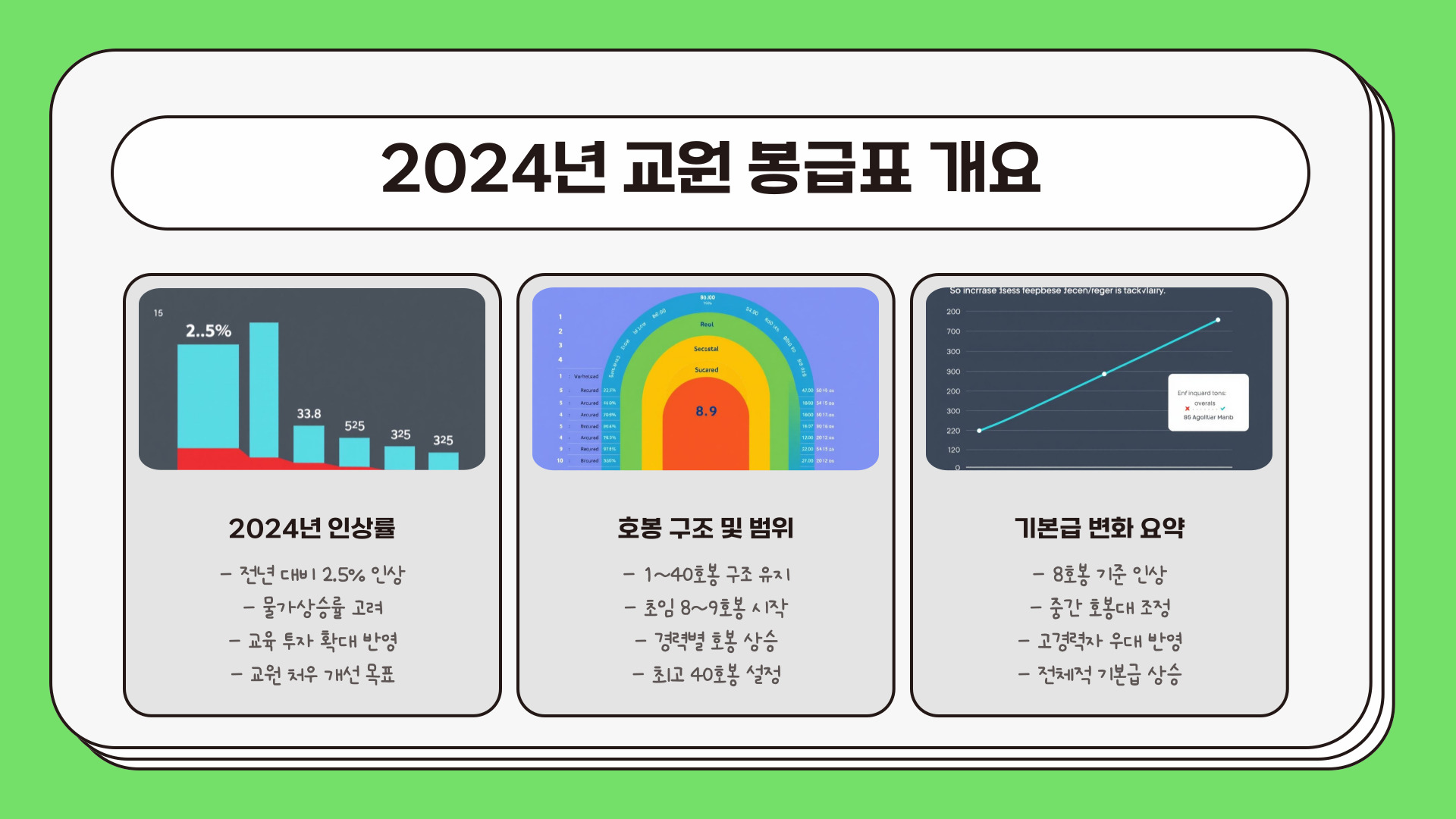 2024년에는 교원의 보수체계에 몇 가지 중요한 변경사항이 적용됩니다. 정부는 교사의 보수 인상률을 3%로 설정하였으며, 이는 최근 몇 년간 정부 부처의 예산 마련과 관련하여 공공서비스 강화의 일환으로 이루어진 결정입니다. 이러한 변화는 교사들, 특히 신규 교사와 저연차 교사들에게 보다 나은 근무 조건과 대우를 제공하기 위한 기반을 마련하고 있습니다.
