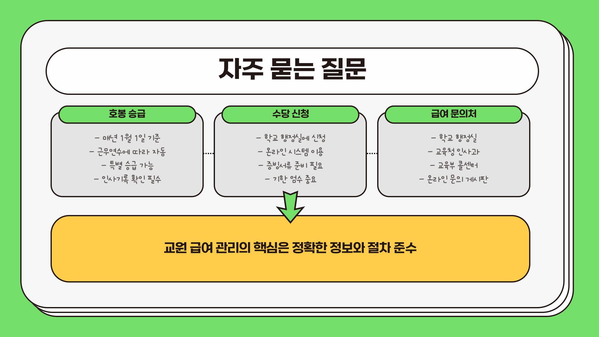 끝으로, 이번 교원 호봉표에서 강조되는 점은 장기적으로 교원들의 직무 만족도를 높이는 방향으로 설계되었다는 것입니다. 교원들의 처우 개선을 위한 다양한 방안이 모색되고 있으며, 이는 학교 교육의 질을 높이는 데 기여할 것입니다.