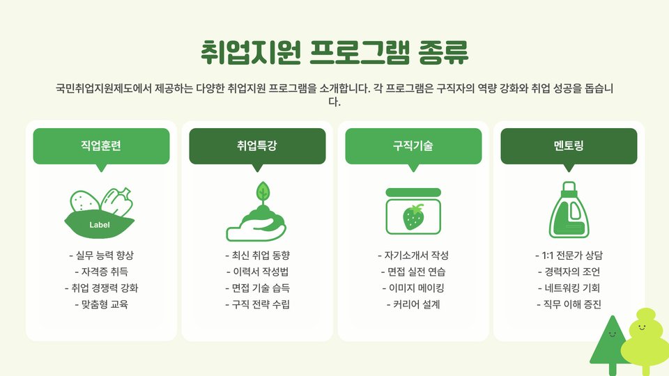 또한, 국민취업지원제도는 취업 지원금과 자기개발 지원을 통해 구직자들이 보다 쉽게 일자리를 찾을 수 있도록 돕습니다. 이 제도를 통해 구직자들은 자기소개서 작성이나 면접 준비에 대한 지원을 받을 수 있습니다.