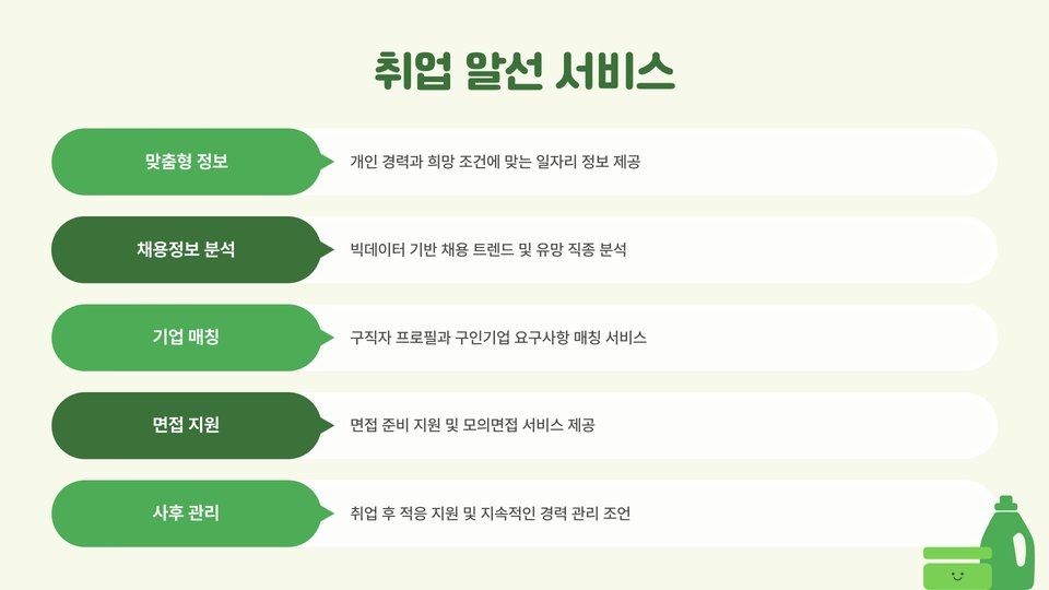 마지막으로, 취업 알선 서비스를 통해 구직자는 직접 여러 기업의 고용 정보를 손쉽게 얻을 수 있습니다. 이는 구직자가 다양한 분야의 일자리를 탐색하고 자신의 경력과 일치하는 직업을 찾아 적절히 지원할 수 있도록 돕습니다. 이를 통해 고용 시장에 보다 원활하게 통합되도록 지원합니다.