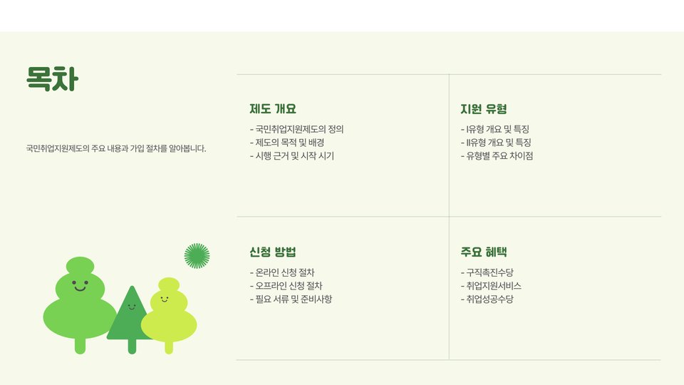 국민취업지원제도는 청년층과 중장년층의 취업을 지원하기 위한 제도입니다. 이 제도는 구직자들에게 필요한 자원과 정보를 제공하여 스스로의 경력을 개발하도록 돕습니다. 제도의 주요 목표는 실업률 감소와 고용 창출입니다.