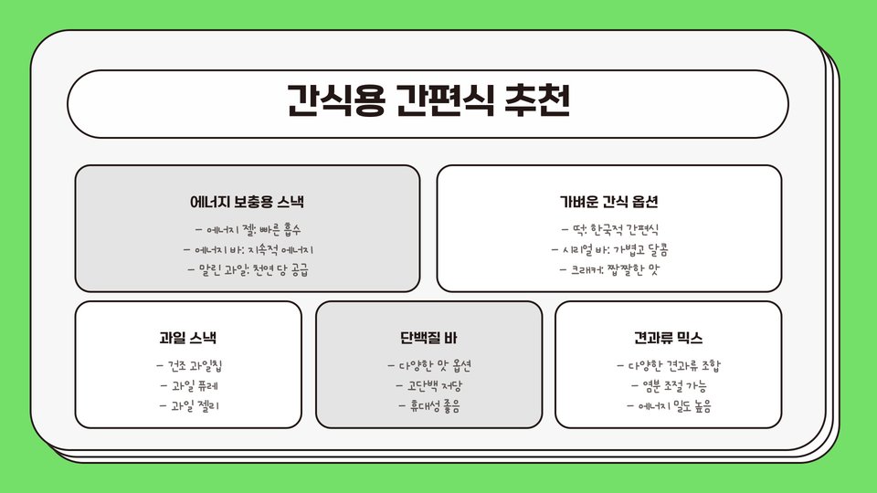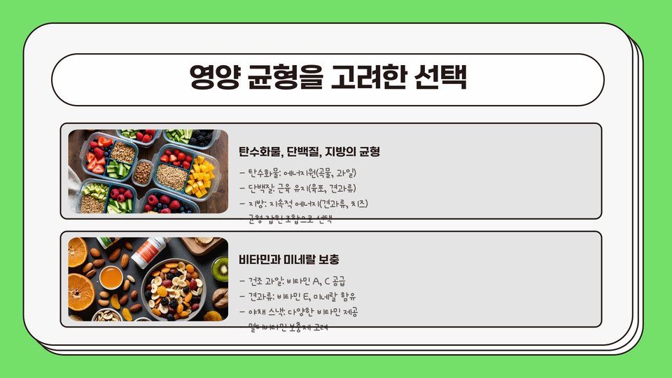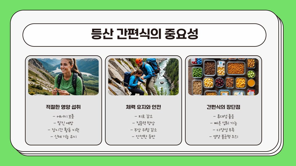 등산 시 에너지를 유지하는 것은 매우 중요합니다. 특히 긴 산행을 계획하고 있다면, 간편식은 필수적입니다. 적절한 영양소와 수분을 공급받지 못하면 피로가 쌓이고 기력이 떨어질 수 있습니다. 따라서 미리 준비한 간편식이 큰 도움이 됩니다. 등산 간편식은 가볍고 쉽게 섭취할 수 있는 음식으로, 생리적으로 필요한 에너지를 즉각적으로 보충해 줍니다.