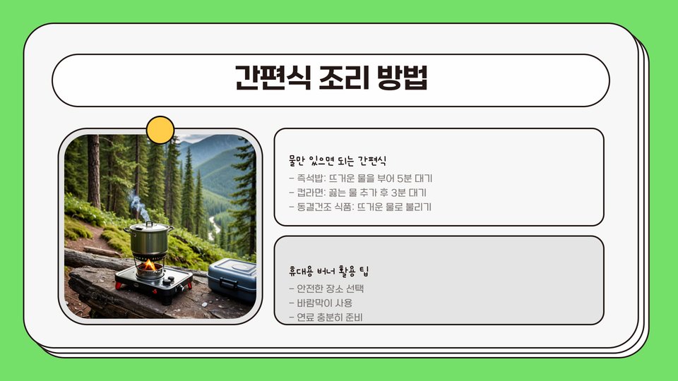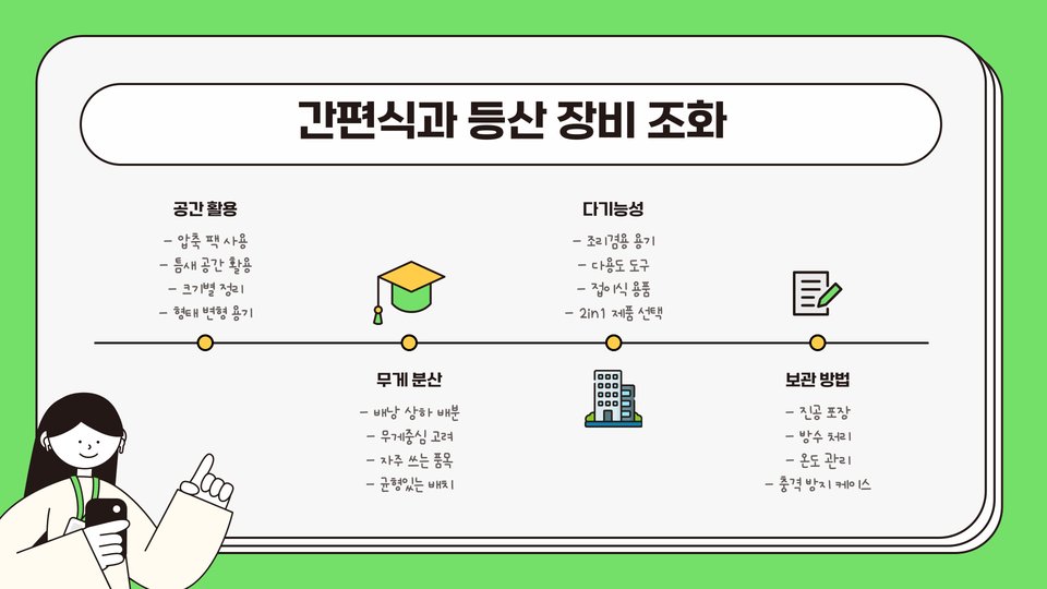 간편식을 준비할 때는 사전에 계획을 세우는 것이 중요합니다. 미리 포장하고, 꼭 필요한 양만큼 준비하는 것이 좋습니다. 과도한 양은 짐이 될 수 있으므로 주의해야 합니다. 보관 방법도 고려해야 합니다. 냉장 보관이 필요한 음식은 여행 전에 미리 준비하고, 상온에서도 보관 가능한 제품을 선택하는 것이 좋습니다.