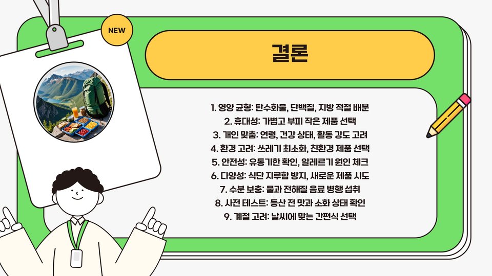 등산 간편식은 초기 선택 단계부터 최적의 영양소와 맛을 고려하여 선택해야 합니다. 또한 수분 공급을 충분히 할 수 있는 준비도 필요합니다. 모든 과정을 통해 자신의 체력과 건강을 고려하여 안전하고 즐거운 등산을 하길 바랍니다. 마지막으로 다음 사항을 유념해 주세요: