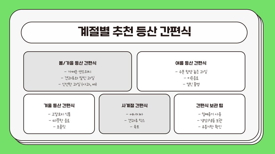 등산에 적합한 간편식을 준비할 때 미리 준비하는 것이 중요합니다. 등산가기 전에 철저하게 계획하여 반드시 필요한 식품을 리스트업하고, 그에 맞춰 간편식을 준비해 두는 것이 좋습니다. 각 식품의 유통기한과 보관 방법도 체크해야 합니다. 예를 들어, 신선한 과일은 쉽게 상할 수 있으므로 산행 당일에 가져가는 것이 좋습니다.