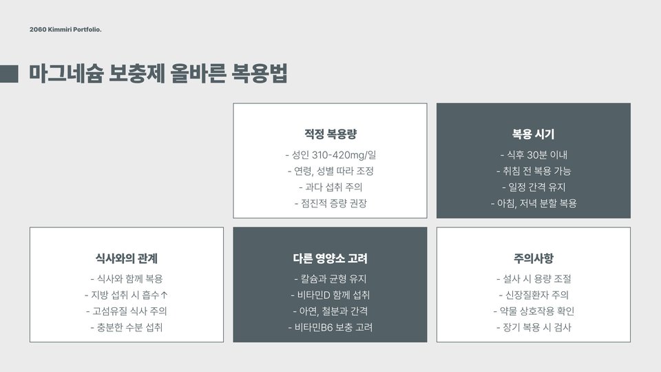 - 마그네슘 보충제를 섭취할 때는 용량을 잘 지켜야 합니다.