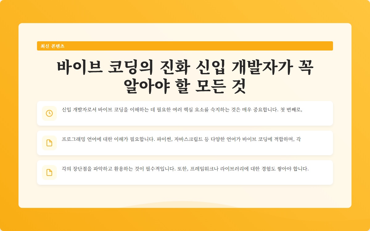 바이브 코딩은 앞으로도 계속 진화할 것입니다. 기술의 발전과 함께 새로운 도구와 방법론이 등장하며, 이는 개발자에게 더 많은 기회를 제공합니다. 예를 들어, 인공지능을 활용한 코드 리뷰 도구가 보편화되면서 개발자는 더욱 창의적이고 복잡한 문제에 집중할 수 있게 될 것입니다. 이러한 변화에 발맞추어 신입 개발자들은 지속적으로 학습하고 적응하는 자세가 필요합니다.