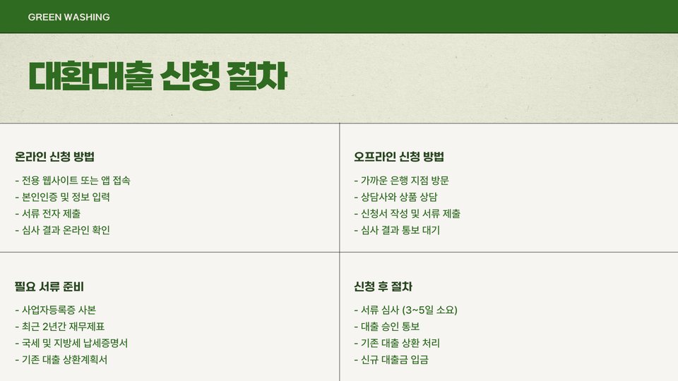 대환대출 신청은 각 은행의 홈페이지 또는 직접 방문하여 할 수 있습니다. 신청 시 필요한 서류는 대출 상품에 따라 조금씩 다를 수 있으나, 기본적으로 사업자등록증, 소득증명서, 신용등급 체크가 필요합니다. 특히 정확한 서류작성이 중요한데, 오류가 있을 경우 대출이 지연되거나 거절될 수 있습니다.