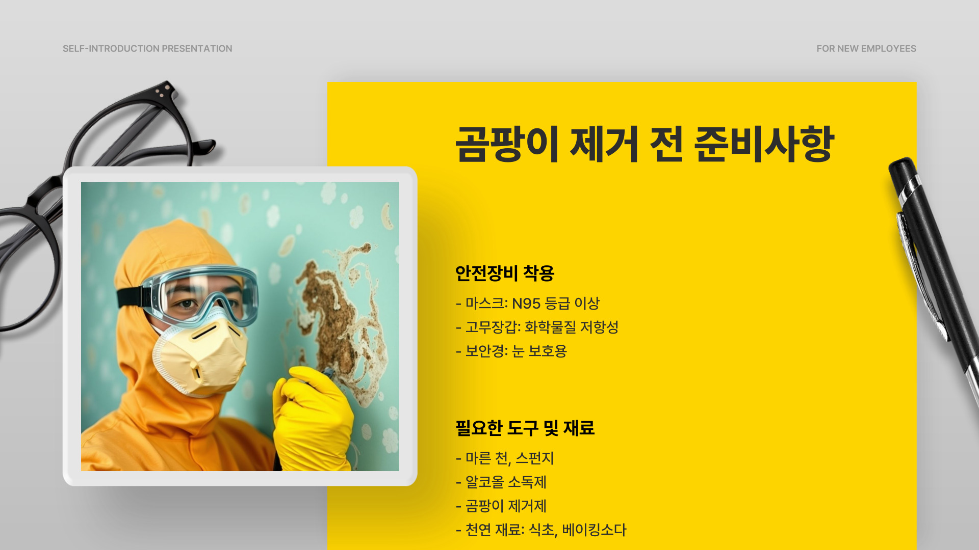 이러한 준비물을 갖춘 후, 곰팡이 제거 작업을 시작할 수 있습니다. 안전 장비를 착용하는 것이 중요합니다. 곰팡이를 직접 만지는 것은 위험할 수 있으므로 반드시 장갑과 마스크를 착용해야 합니다.