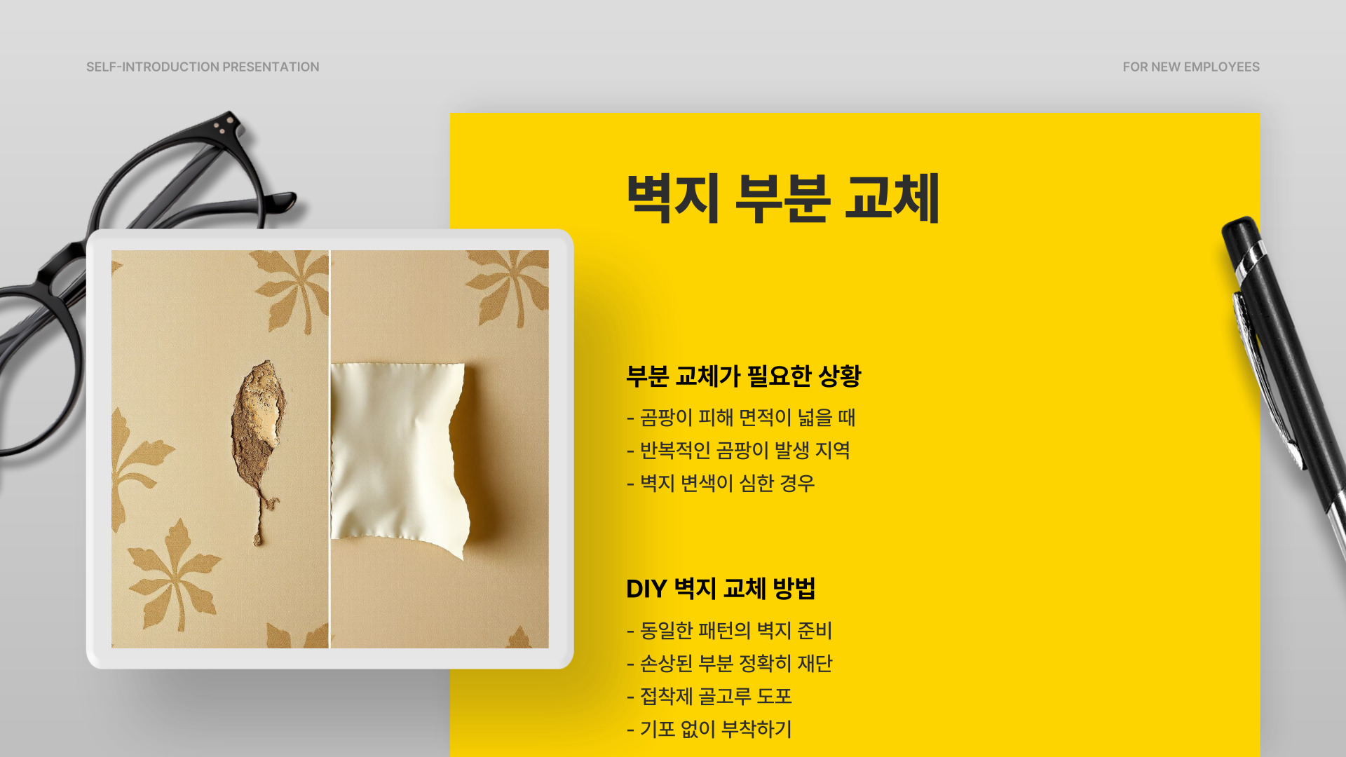 - 손상된 벽지는 즉시 교체할 것