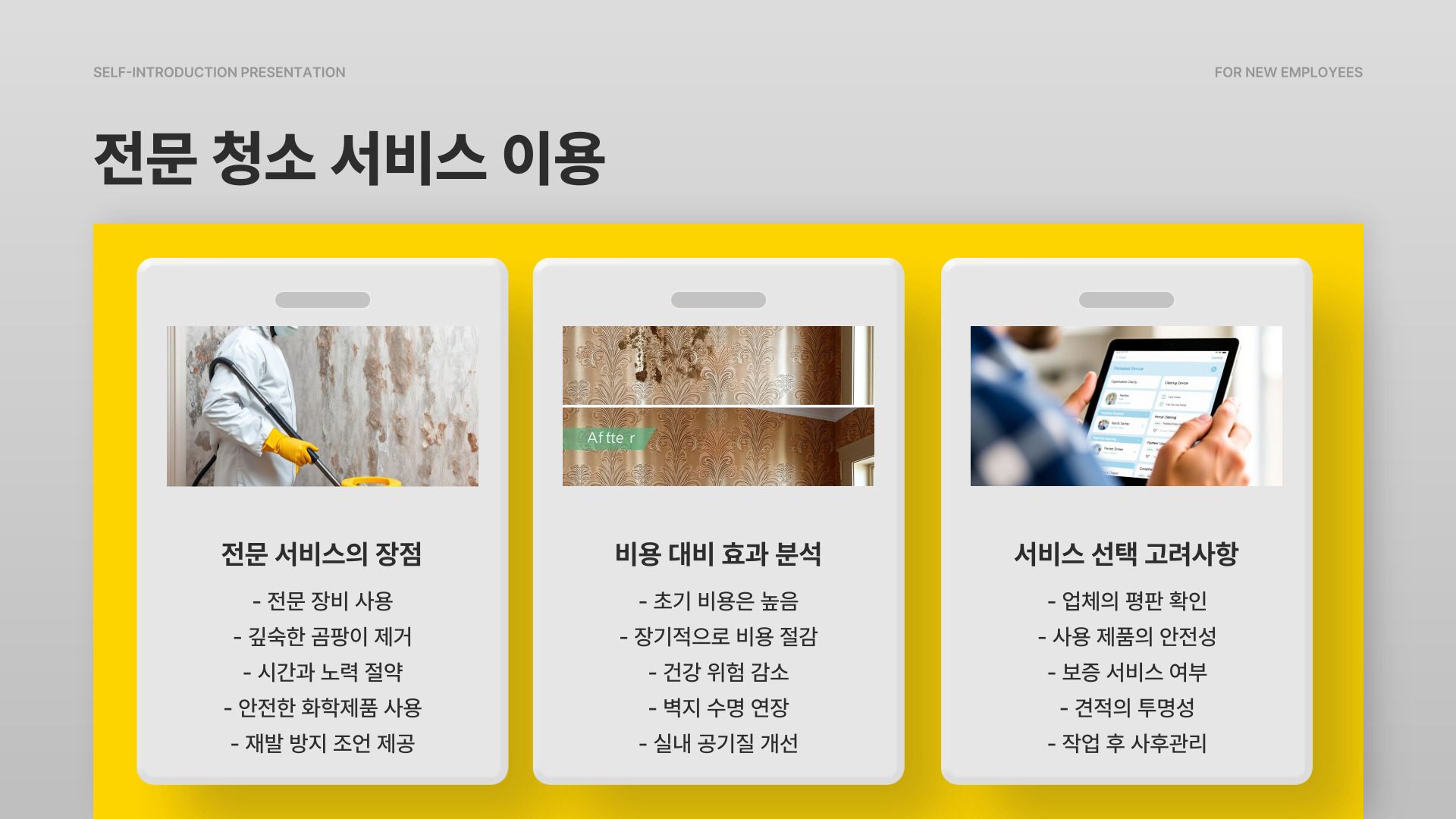 - 전문가 상담: 곰팡이가 심각할 경우 전문가의 도움을 받는 것이 좋습니다.