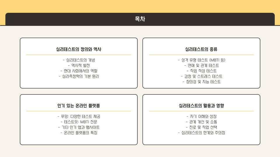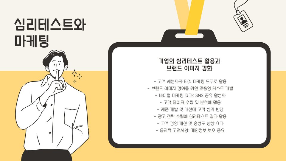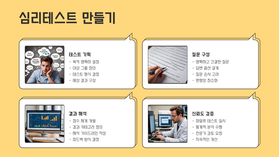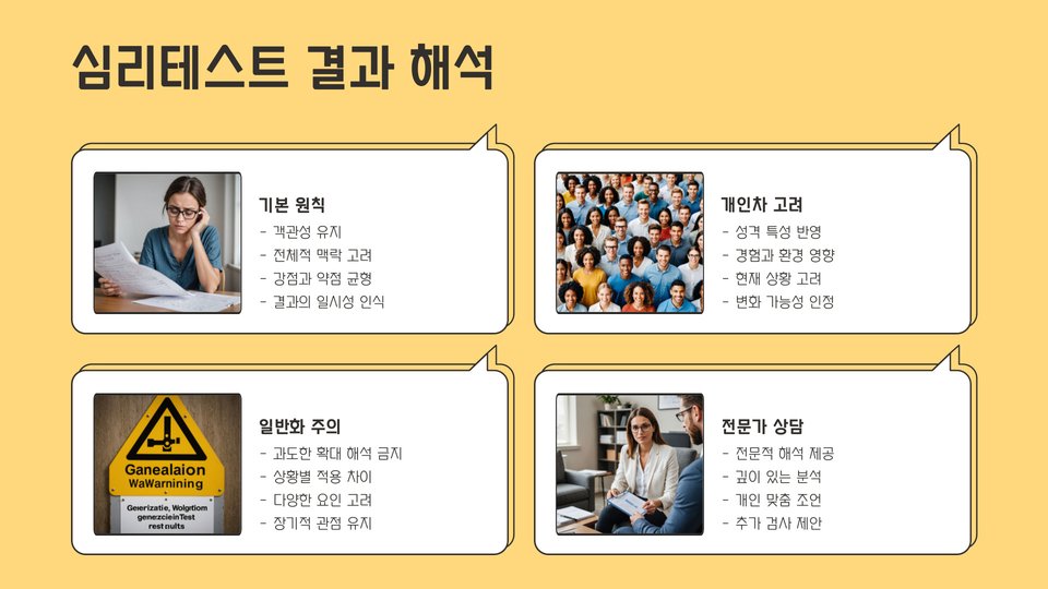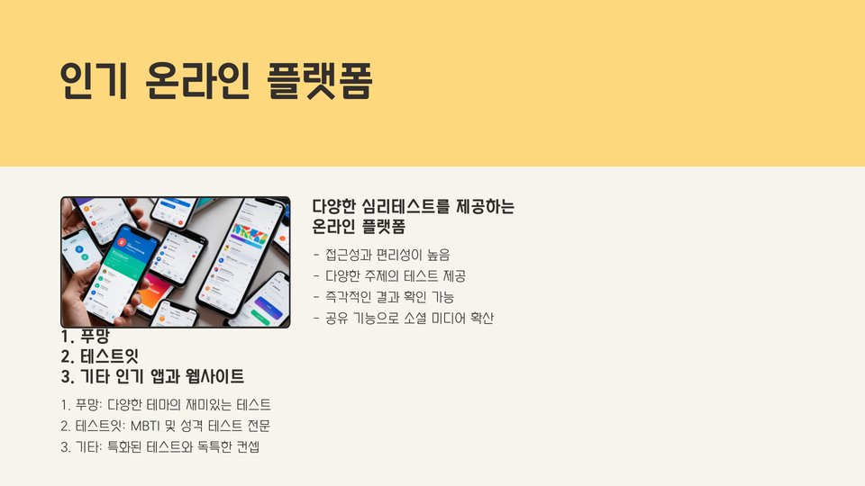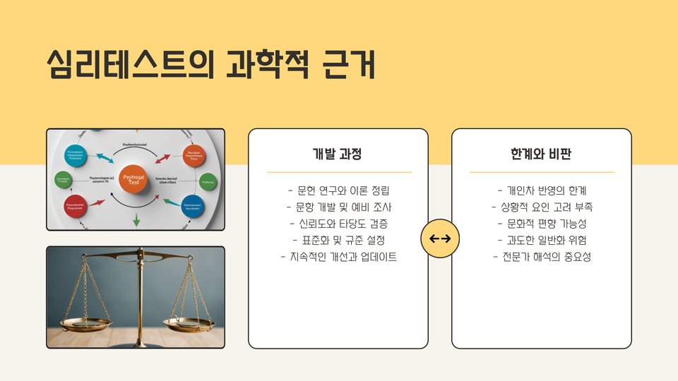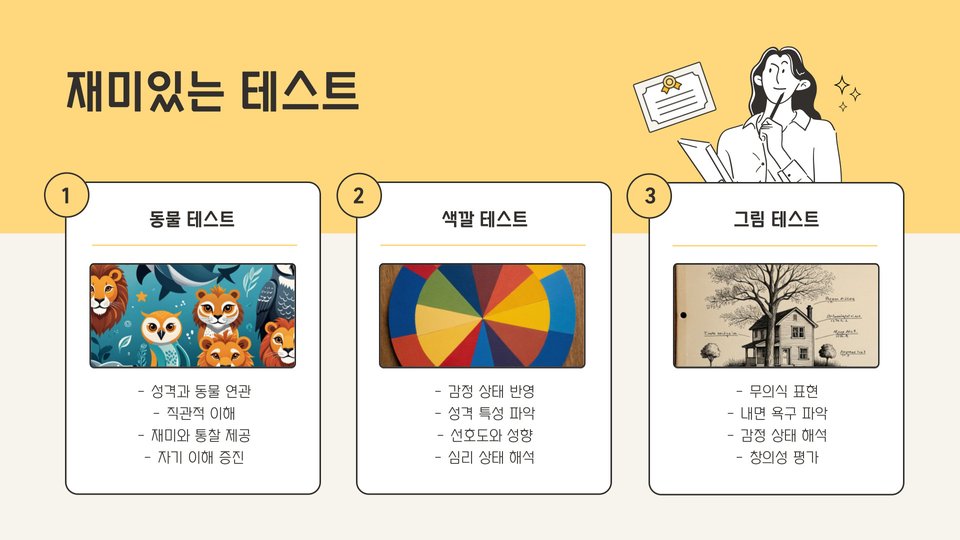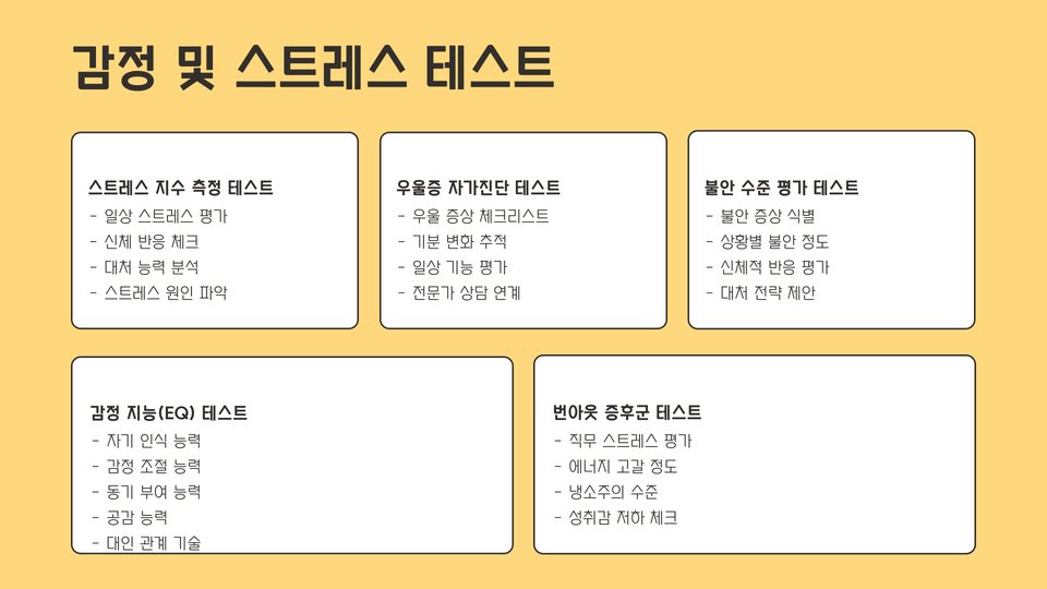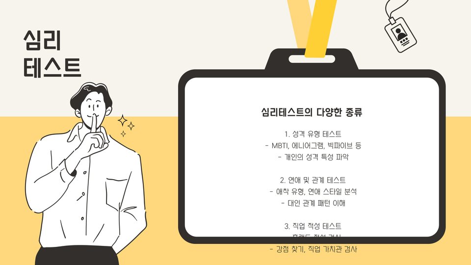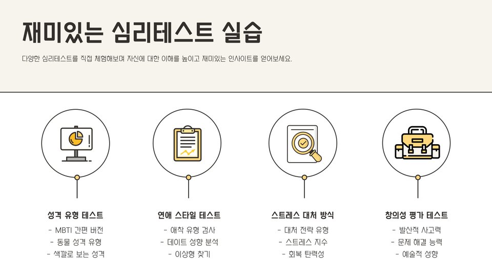 - 심리테스트는 자기 이해와 정서 조절에 도움을 줍니다.