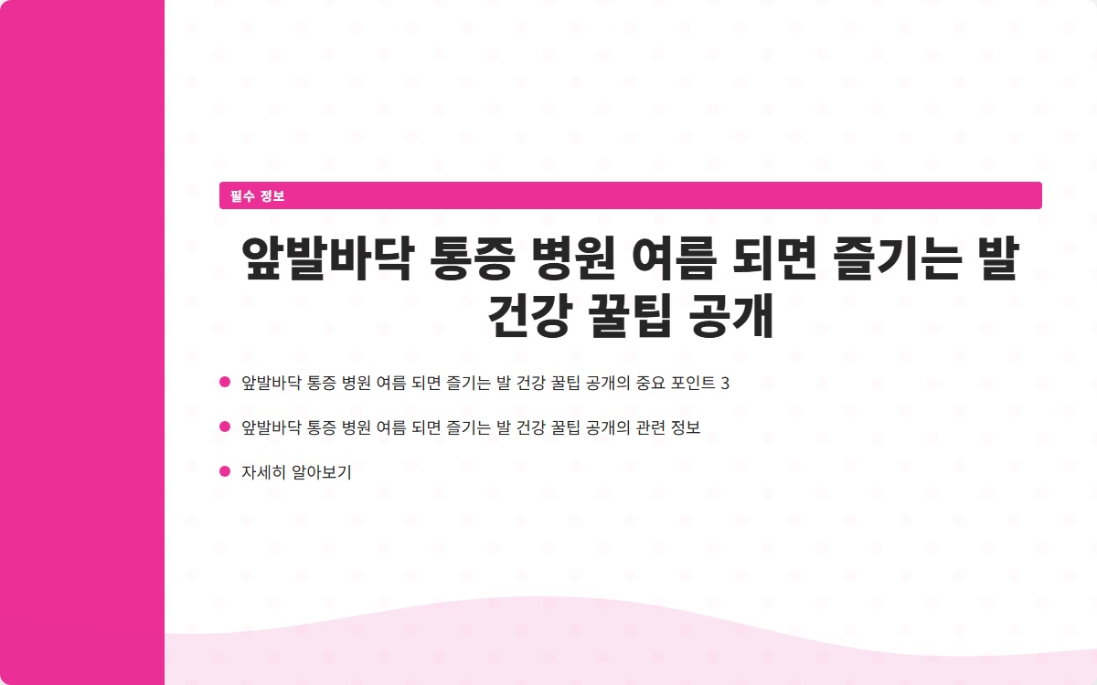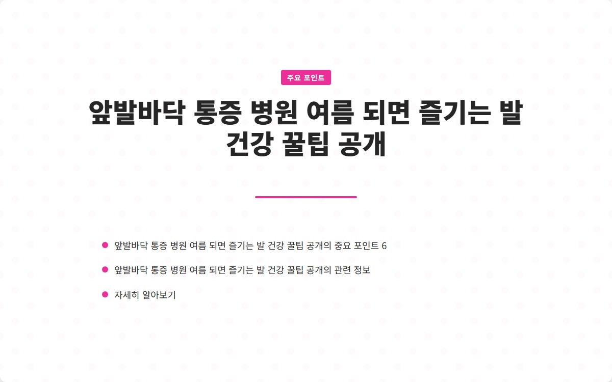 여름철 앞발바닥 통증은 다양한 원인에 의해 발생할 수 있으며, 적절한 관리와 예방이 필요합니다. 작은 증상이라도 조기에 대처하는 것이 중요합니다. 올바른 신발 선택과 정기적인 관리가 발 건강을 지켜줄 것입니다!