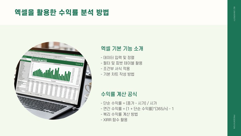 엑셀을 사용하면 데이터를 체계적으로 관리하고 분석할 수 있습니다. 예를 들어, 다양한 투자 자산의 수익률을 정리하여 비교하는 표를 만들거나, 차트를 통해 시각적으로 도표화하여 쉽게 파악할 수 있습니다. 이러한 분석 덕분에 투자자들은 어떤 자산이 가장 높은 수익률을 보였는지를 신속하게 확인할 수 있습니다.