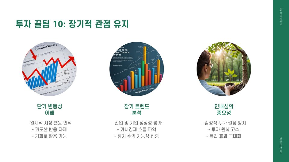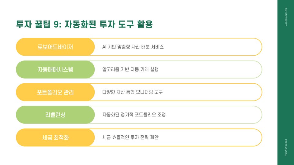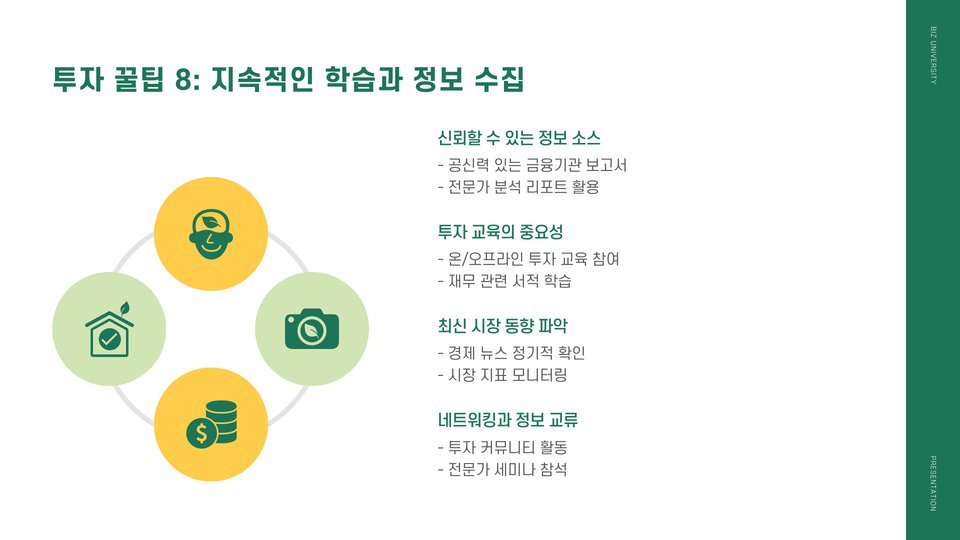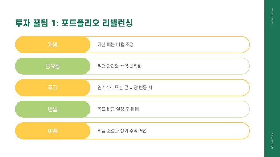 투자를 할 때 염두에 두어야 할 몇 가지 꿀팁이 있습니다. 먼저, 자기 자신을 잘 알고 투자하는 것이 중요합니다. 각자의 위험 감수 성향에 따라 투자 전략이 달라질 수 있기 때문입니다. 또한, 분산 투자를 통해 리스크를 줄이는 것도 좋은 방법입니다. 한 가지 투자처에 몰빵하기보다는 여러 곳에 나누어 투자하는 것이 좋습니다.