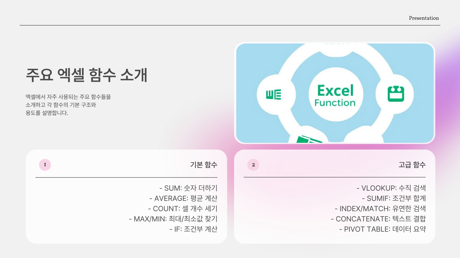 엑셀 함수는 데이터를 처리하고 분석하는 데 도움을 주는 명령어입니다. 함수는 일반적으로 함수 이름과 인수로 구성됩니다. 인수는 함수가 작업을 수행하는 데 필요한 추가 정보입니다. 예를 들어, SUM 함수는 숫자의 합계를 계산하는 함수이며, 인수로는 더하고자 하는 셀 범위를 포함합니다. 따라서 함수와 인수를 이해하는 것은 엑셀을 효과적으로 활용하는 첫걸음입니다.