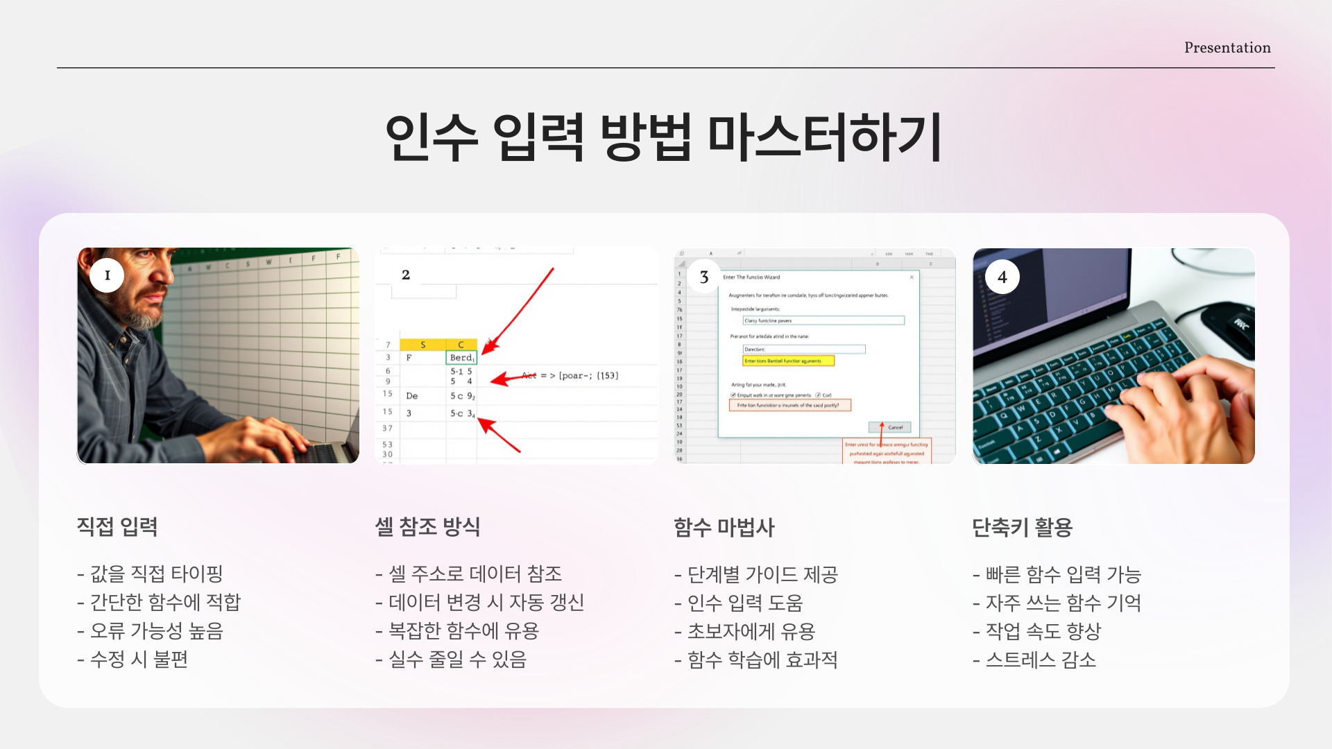 둘째, 함수 마법사를 활용하는 것도 좋은 방법입니다. 엑셀에는 함수 마법사가 내장되어 있어, 함수에 필요한 인수를 쉽게 입력할 수 있도록 도와줍니다. 필요한 인수를 입력하면 함수가 자동으로 생성되므로 스트레스를 덜 수 있습니다.