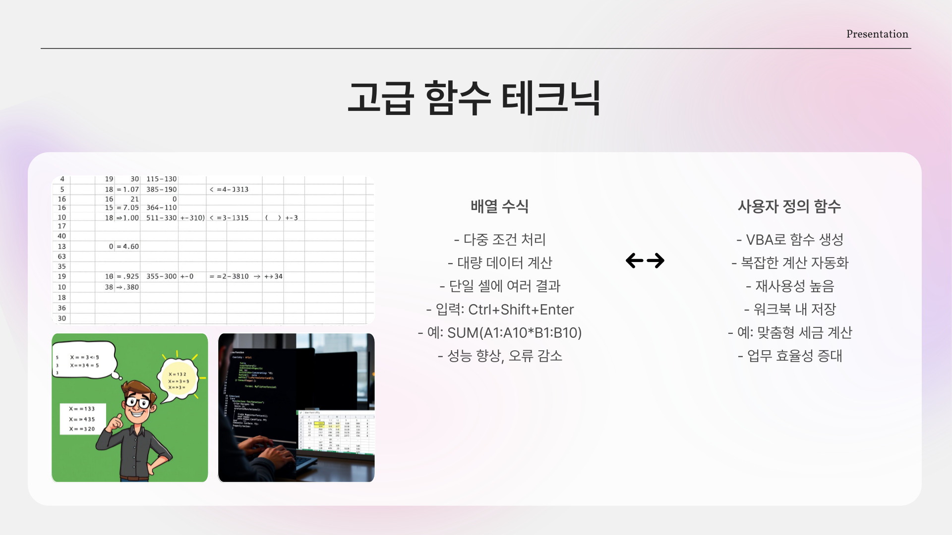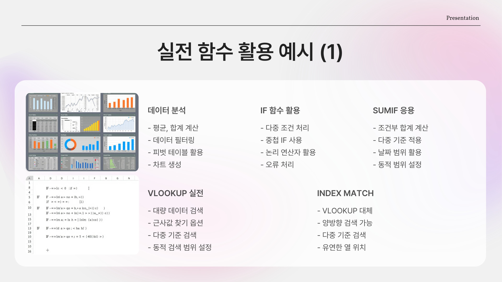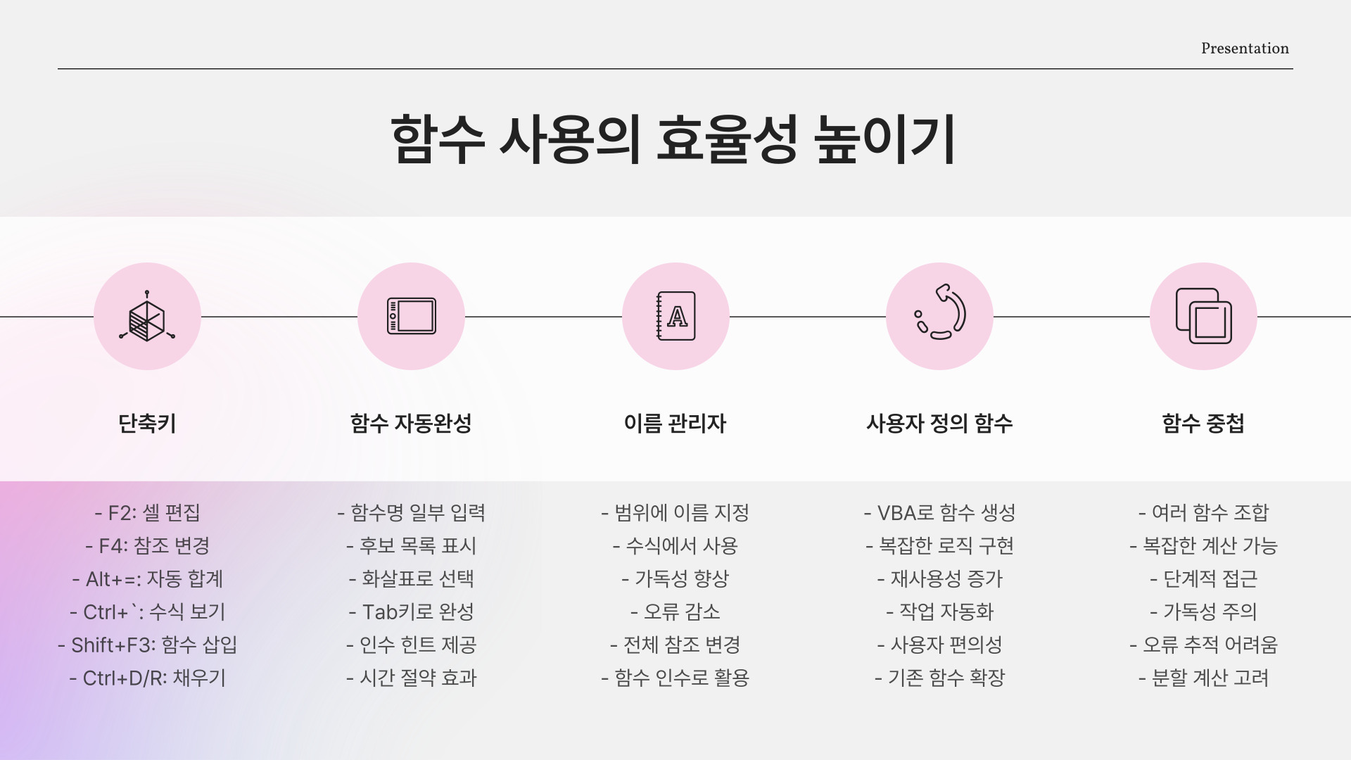 이처럼 함수와 인수를 적절히 조합하면 복잡한 데이터에서도 원하는 결과를 쉽게 도출할 수 있습니다. 각 함수마다 요구하는 인수의 숫자와 유형이 다르므로, 그에 맞춰 신중하게 선택할 필요가 있습니다.