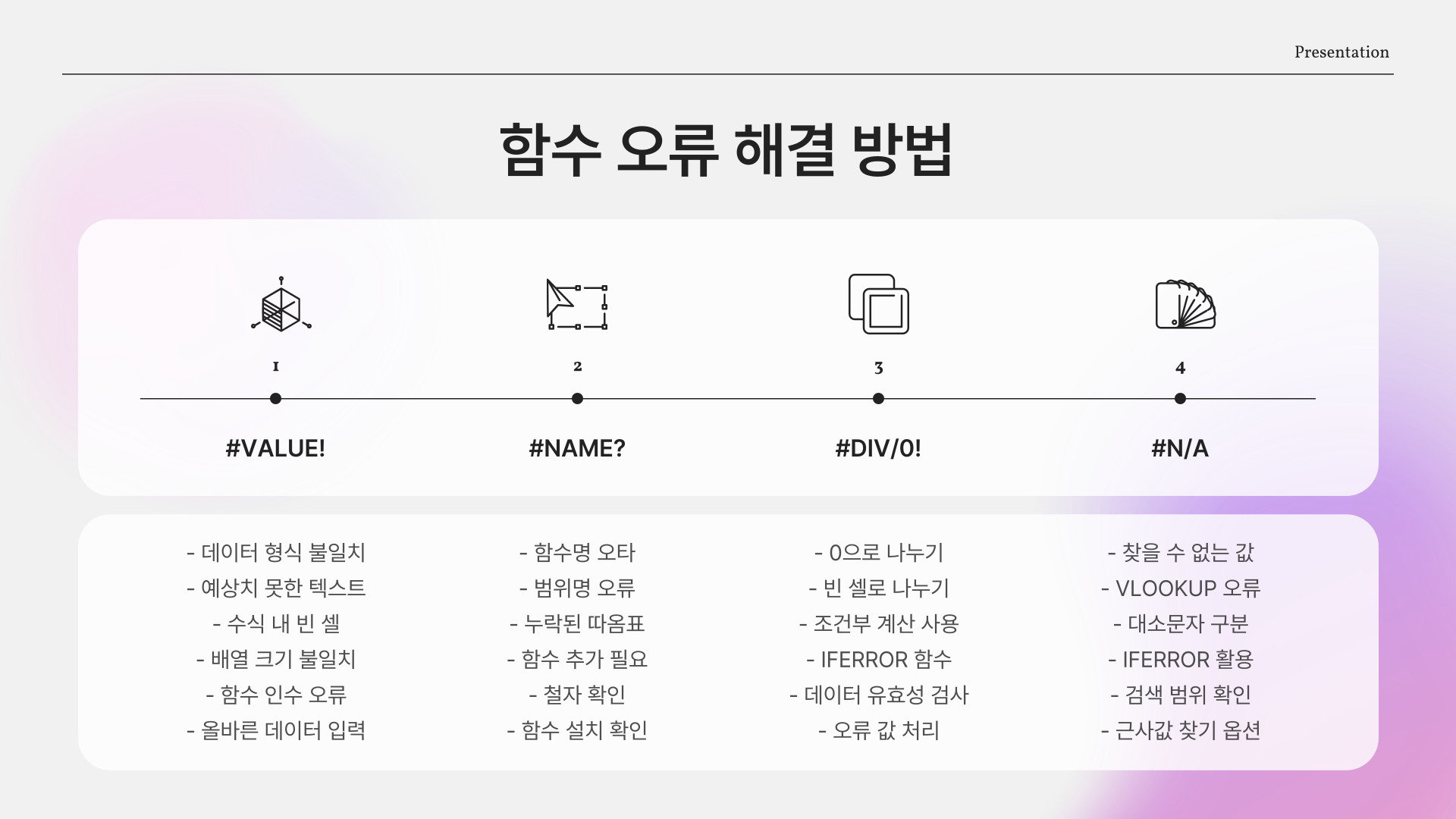 엑셀 함수는 인수를 잘못 입력하면 다양한 오류 메시지를 표시합니다. 이러한 오류를 해결하는 방법은 다음과 같습니다. 가장 흔한 오류는 #VALUE!입니다. 이는 입력된 값이 예상과 다를 때 발생합니다. 이 경우, 입력된 데이터 형식을 확인하고 올바른 형식으로 수정해야 합니다.