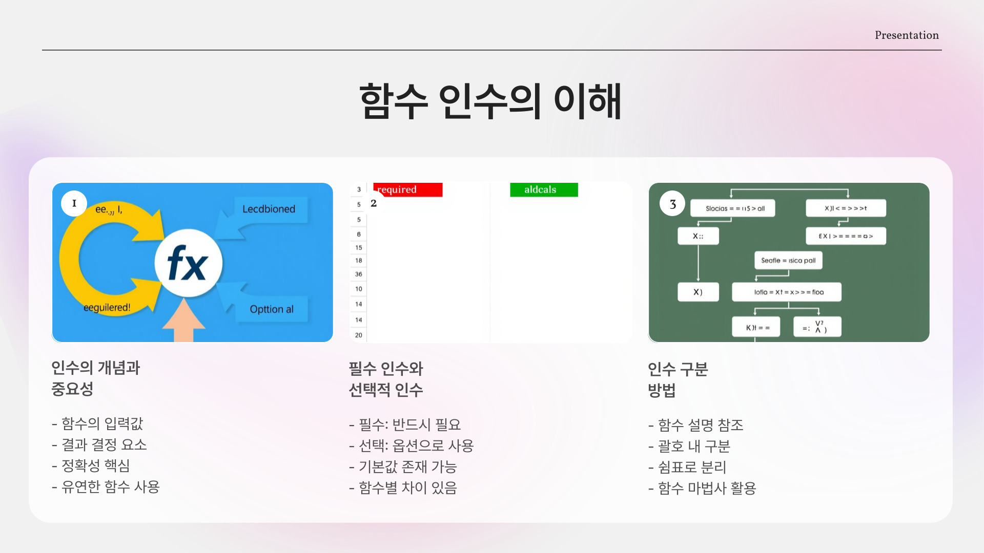 - 인수는 필수 인수와 선택 인수로 나뉘며, 구분이 중요하다.