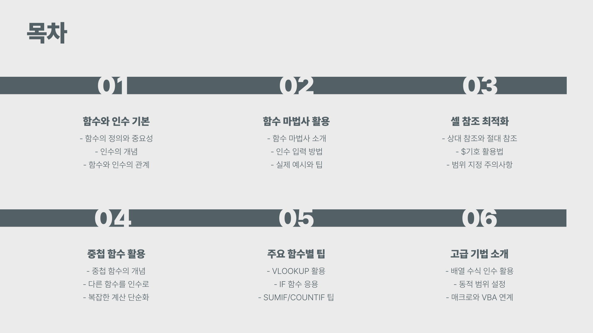 • SUM, AVERAGE, COUNT 등 기본 함수 이해가 필요합니다.