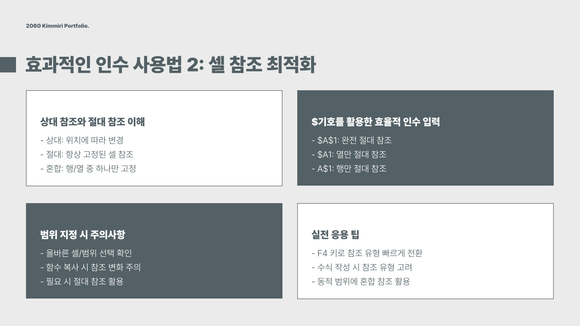 • 셀 참조와 이름 정의 기능 활용으로 효율성 증대 가능.