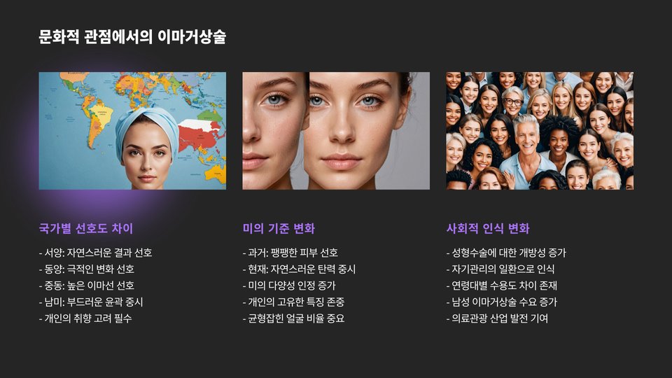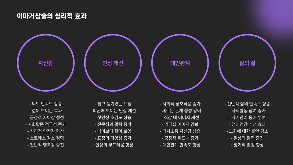 사실, 이마거상은 단순히 미용적인 이유만으로 시행되는 것이 아닙니다. 심리적인 안정감을 찾기 위한 과정이기도 하며, 개인의 프로필과 인상을 크게 변경할 수 있는 기회를 제공합니다. 이러한 변화는 외모뿐만 아니라 정신적인 영역에서도 긍정적인 기여를 할 수 있습니다.