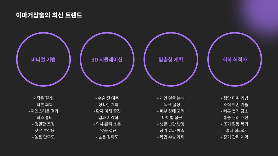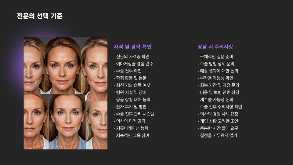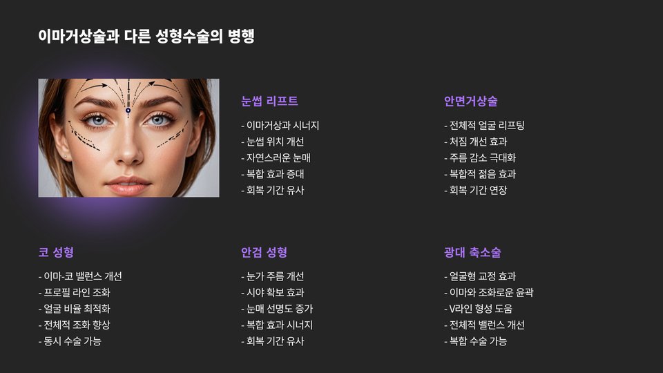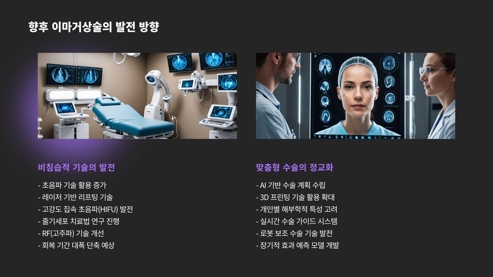또한, 수술을 고려하기 전에 피부의 기본 상태와 건강을 점검하는 것이 중요합니다. 피부가 건강하지 않다면 결과가 생각보다 좋지 않을 수 있으므로, 사전에 피부 치료나 관리가 필요시기를 고려해야 합니다. 이마거상은 단기적인 효과뿐만 아니라 피부의 장기적인 건강에도 영향을 미칠 수 있는 만큼, 충분한 사전 조사가 필요합니다.