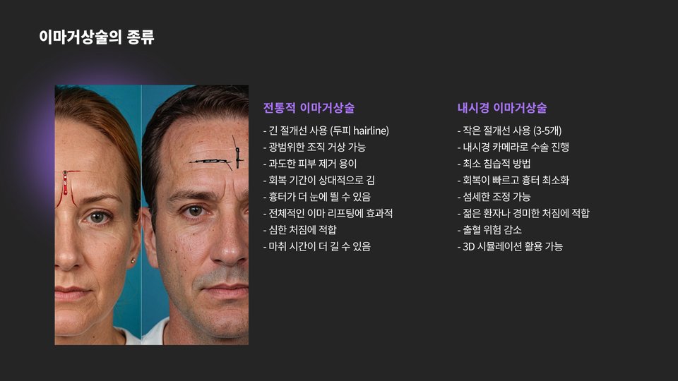 이마거상은 주로 노화로 인한 피부 처짐을 해소하는 데 필요한 기술입니다. 피부 처짐은 자연스러운 노화 과정의 일부지만, 많은 사람들은 이를 해결하고자 합니다. 이마 부위의 주름은 종종 불안감이나 스트레스를 유발할 수 있으며, 이는 대인관계에서의 자신감을 떨어뜨릴 수 있습니다.