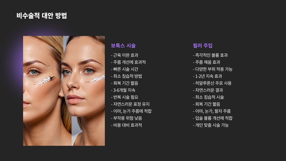 이마거상은 효과적인 시술이지만, 모든 사람에게 적합한 것은 아닙니다. 비수술적 방법으로는 보톡스, 필러 등이 있으며, 이러한 방법들은 주름 개선에 효과적입니다. 또한, 피부 관리 및 생활습관 개선을 통해 주름을 예방하고 개선할 수 있습니다. 정기적인 스킨케어와 충분한 수분 섭취는 피부 건강에 많은 도움이 됩니다.