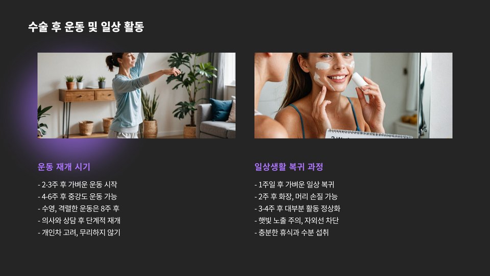 두 번째로는 수술 부위의 청결 유지입니다. 감염을 방지하기 위해 지시된 일정에 따라 일상적인 세안을 진행하되, 수술 부위를 직접적으로 문지르지 않는 것이 중요합니다. 또한, 특정한 제품이나 화장을 사용하는 것은 필수적인 치료가 완료될 때까지 피하는 것이 좋습니다.