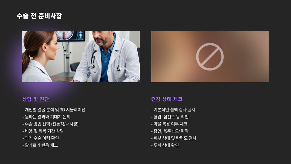 이마거상 수술을 결정하기 전에는 충분한 준비 과정이 필요합니다. 첫 번째로, 의료진과의 상담이 필수적입니다. 상담 시 원하는 결과를 명확히 하고, 예기치 못한 문제를 예방하기 위한 방안을 모색해야 합니다. 적절한 의료진과 병원을 선택하는 과정에서 주의할 점은, 충분한 경험과 전문성을 갖춘 의료진 찾아야 한다는 것입니다.
