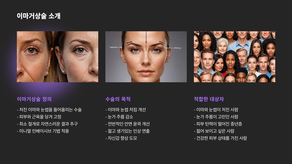 이마거상은 이마 부위의 피부를 리프팅하여 주름을 감소시키고, 전체적인 얼굴의 젊음을 되찾아주는 시술입니다. 이 시술은 주로 노화로 인해 생기는 주름을 개선하기 위해 시행됩니다. 이마거상은 다양한 방법으로 이루어질 수 있으며, 일반적으로 수술적 방법과 비수술적 방법이 있습니다. 수술적 방법은 피부를 절개하고 여분의 피부를 제거하여 팽팽한 상태로 만드는 반면, 비수술적 방법은 레이저, 실 리프팅 등 다양한 기술을 이용해 피부를 리프팅합니다.