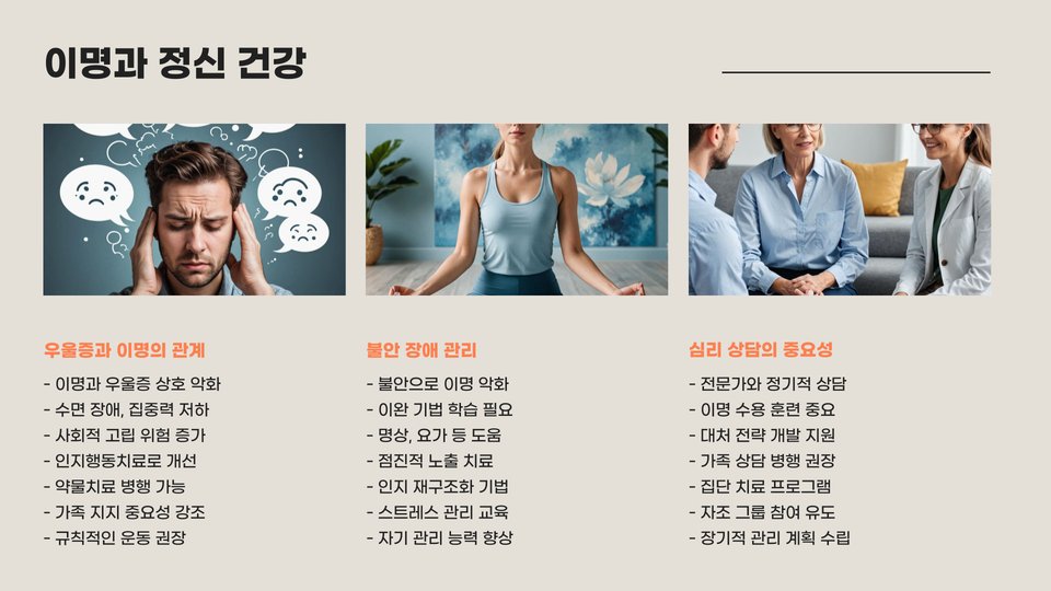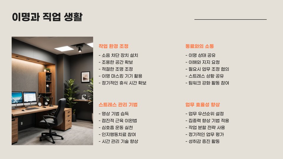또한, 심리 치료를 통해 스트레스를 줄이고, 이명에 대한 인식을 변화시킬 수 있습니다. 이러한 방법들은 이명을 완전히 없앨 수는 없지만, 일상 생활에서 느끼는 불편함을 줄여주는 데 도움을 줄 수 있습니다.