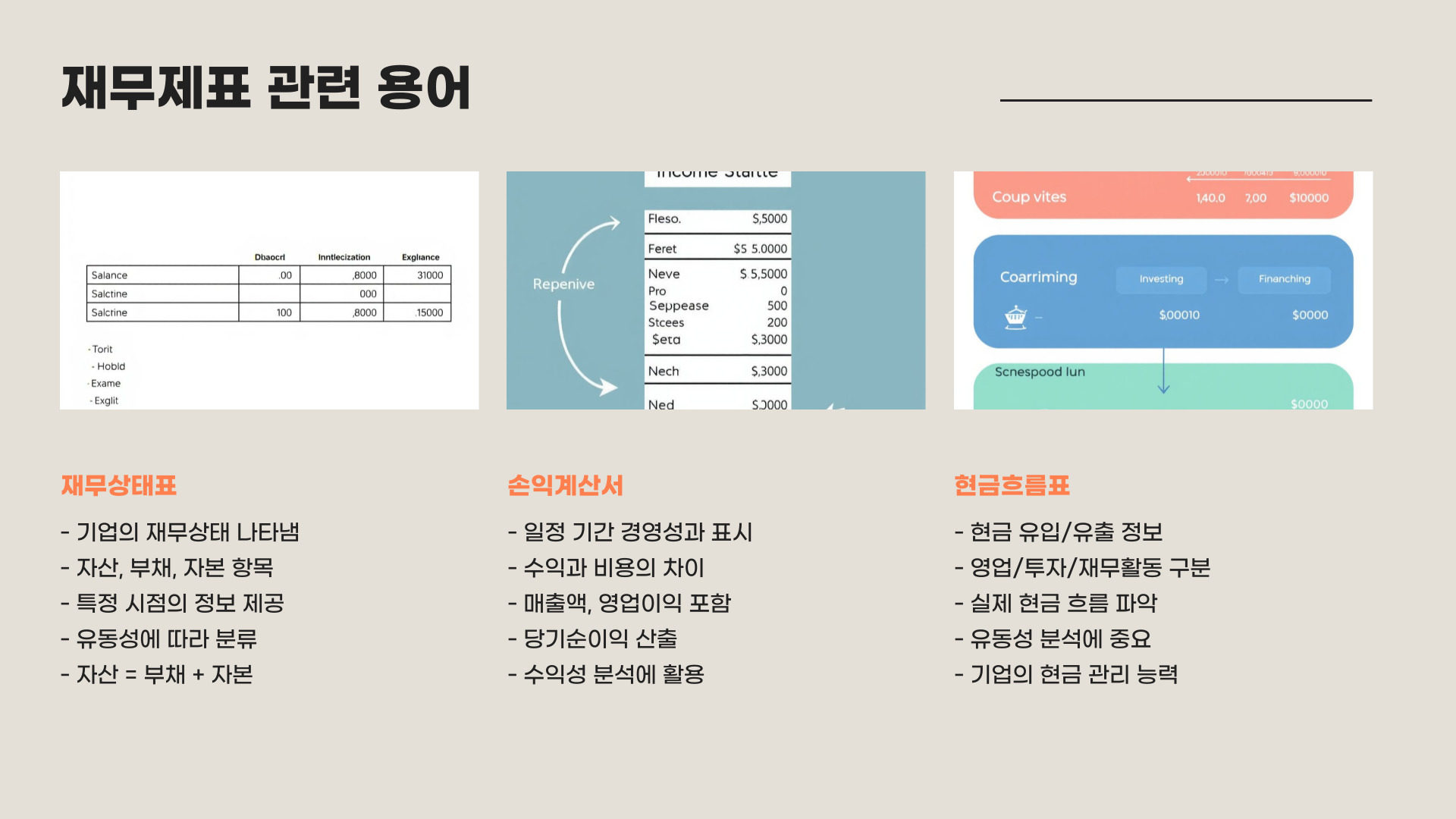 - 재무제표는 재무상태표, 손익계산서, 현금흐름표로 구성됨
