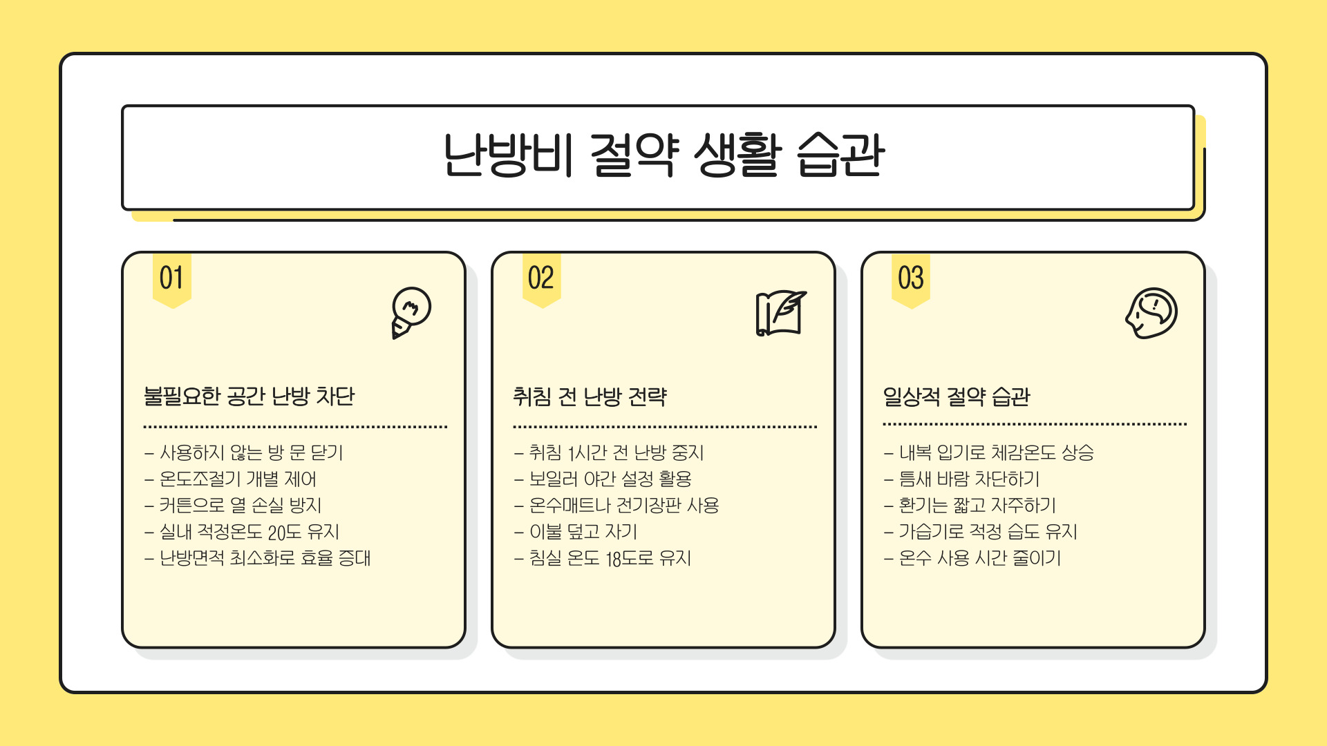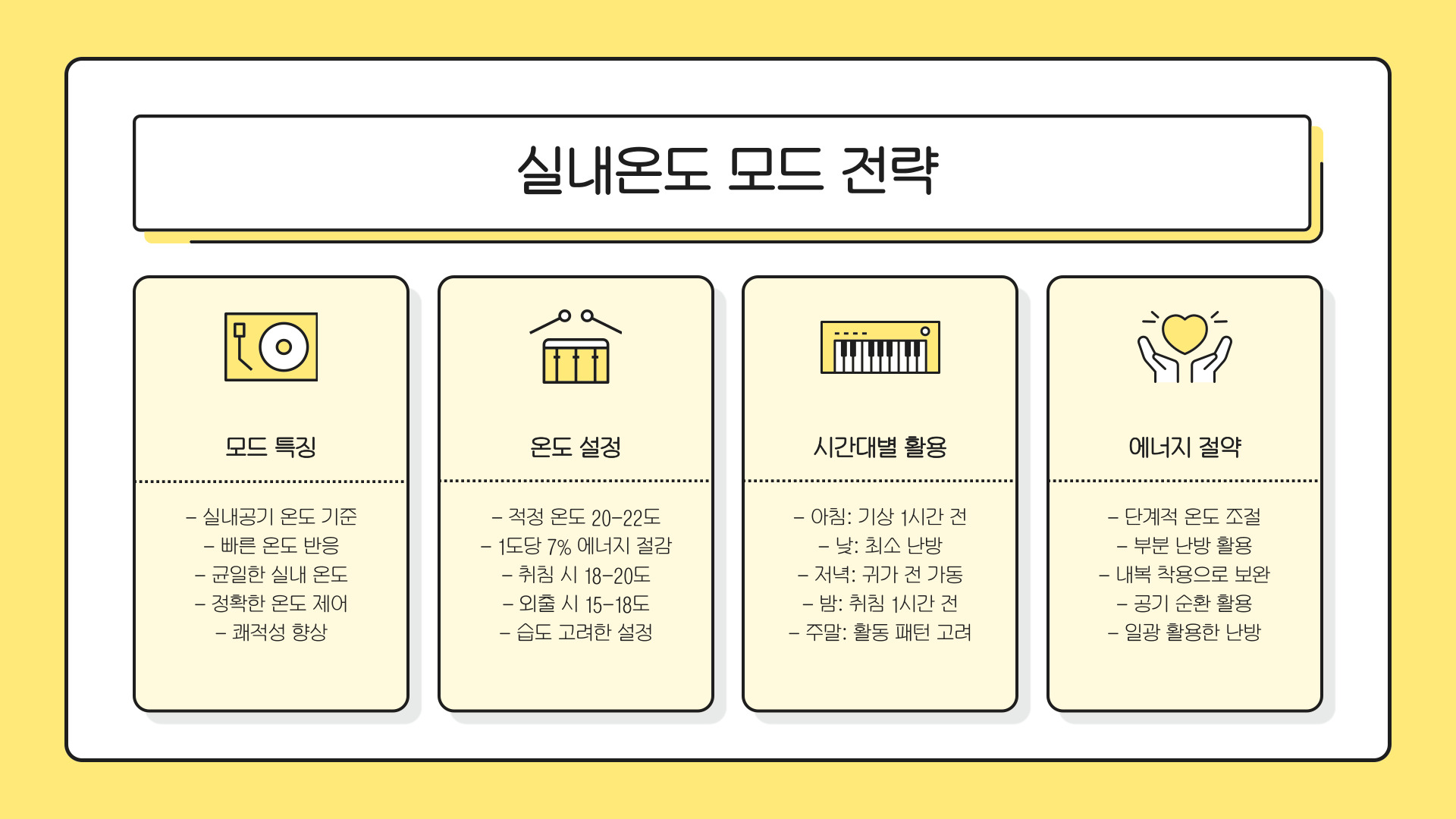 - 적정 온도 설정과 스마트 온도 조절기로 에너지 소비를 최소화한다.