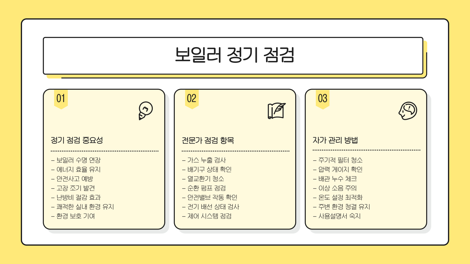 - 정기적인 보일러 점검은 성능 유지 및 비용 절감에 필수적이다.