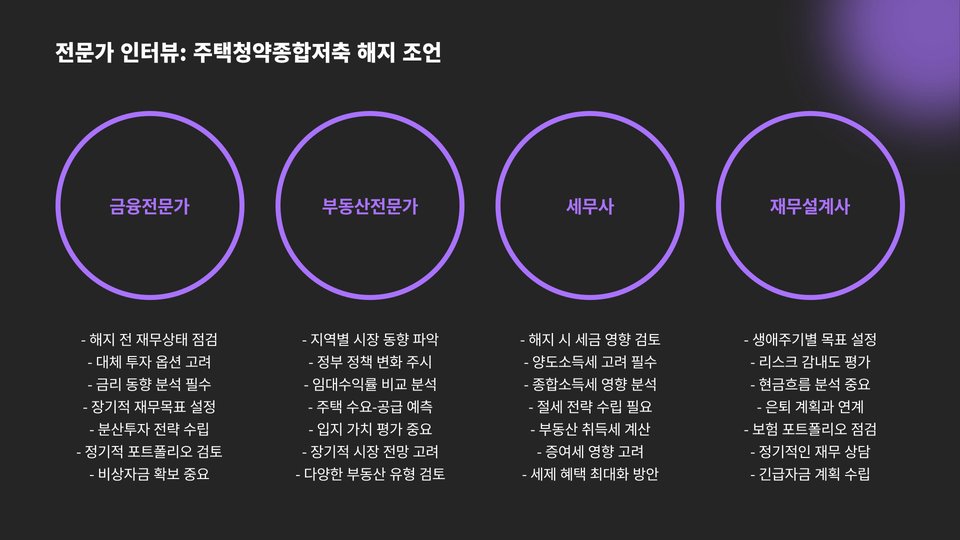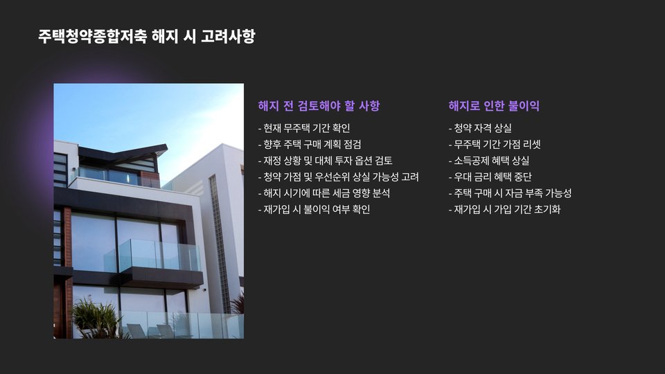 마지막으로, 주택청약종합저축 해지 후에는 향후 주택 구매 계획을 잘 세워야 합니다. 해지로 인해 청약 순위가 초기화되므로, 다른 방법으로 청약 기회를 타진할 필요가 있습니다. 또한, 해지 후 자금 운용에 대한 계획을 세우는 것도 중요합니다.