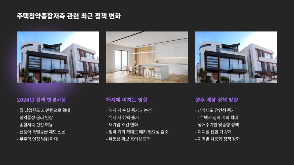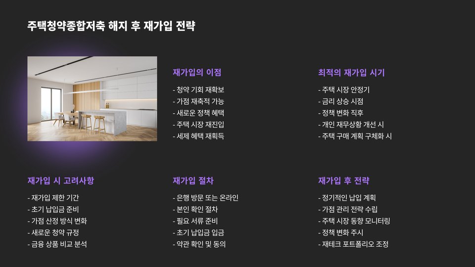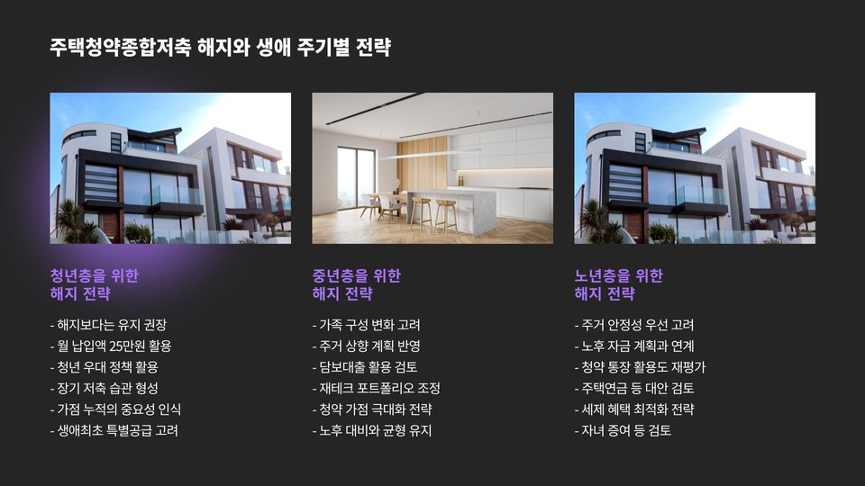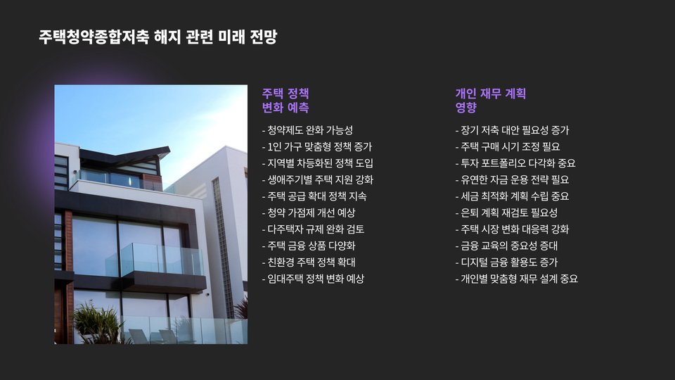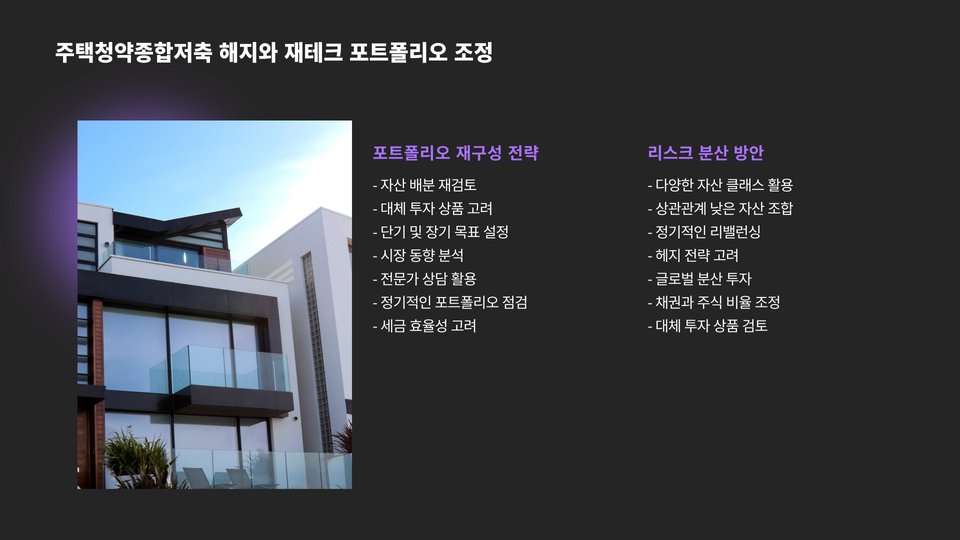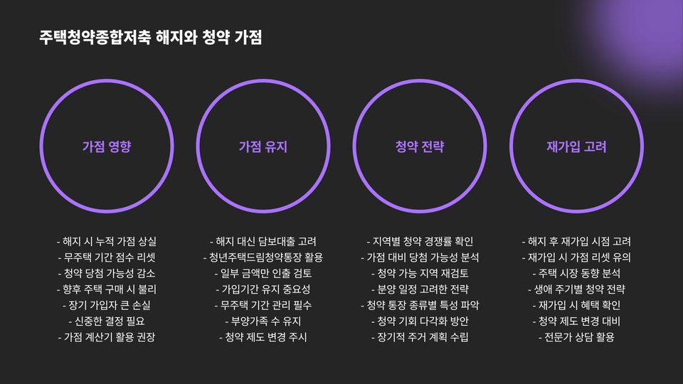마지막으로, 주택청약종합저축 해지 후에는 향후 주택 구매 계획을 잘 세워야 합니다. 해지로 인해 청약 순위가 초기화되므로, 다른 방법으로 청약 기회를 타진할 필요가 있습니다. 또한, 해지 후 자금 운용에 대한 계획을 세우는 것도 중요합니다.