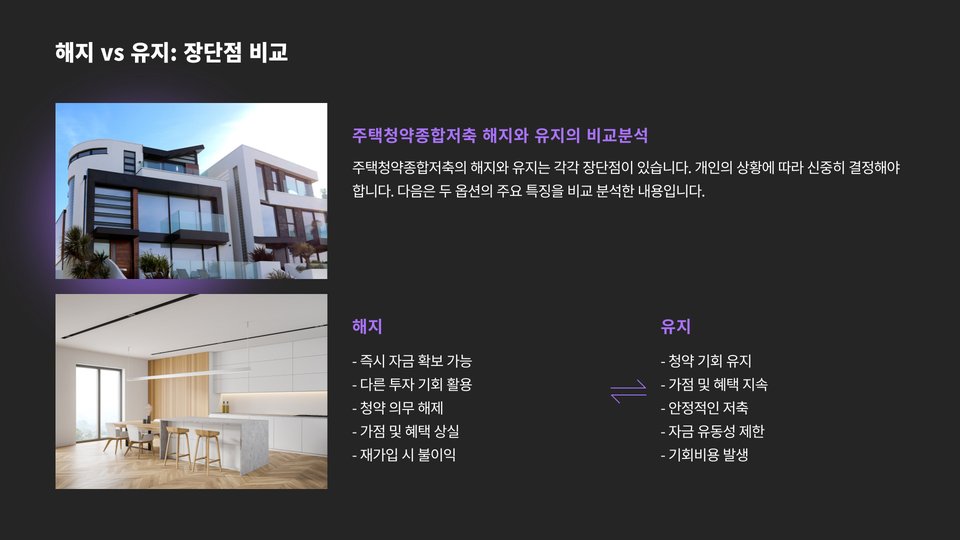 특히 주택청약 종합저축 해지는 개인의 미래 주택 계획에 상당히 큰 영향을 미칠 수 있습니다. 해지 후에는 남은 자금을 다른 용도로 활용할 수 있지만, 청약 상품의 특성상 일정 기간 자금을 묶어두었다가 이자를 많이 받을 수 있는 점도 고려해야 합니다. 따라서 이러한 장점과 단점을 잘 분석하고 결정하는 것이 중요합니다.