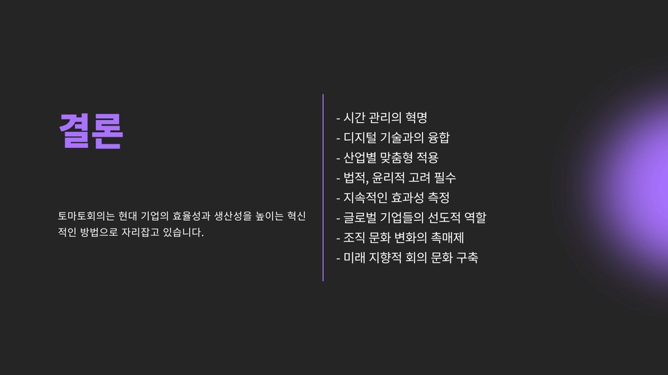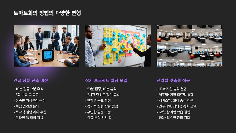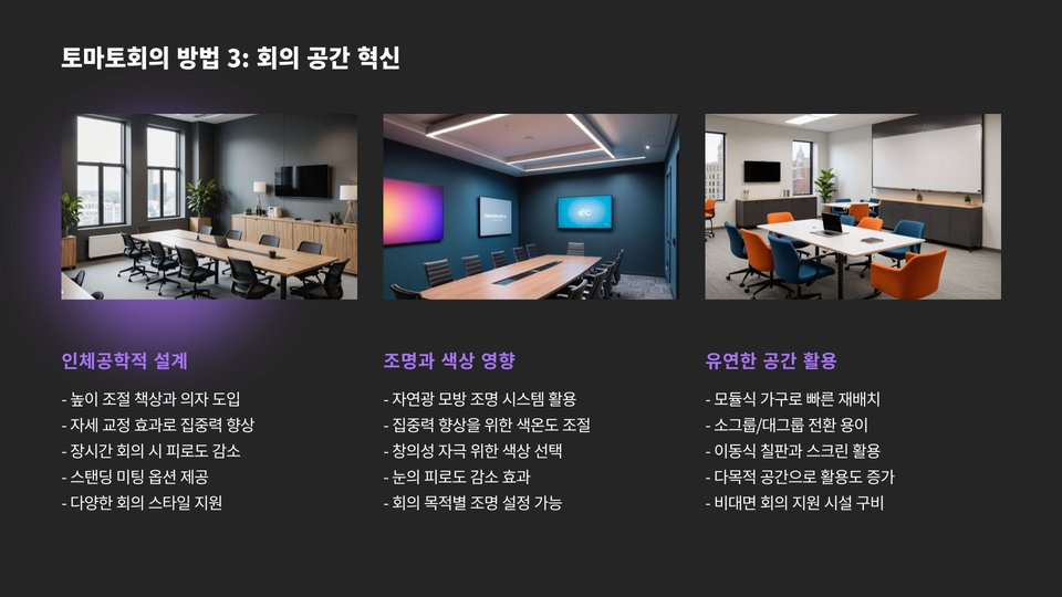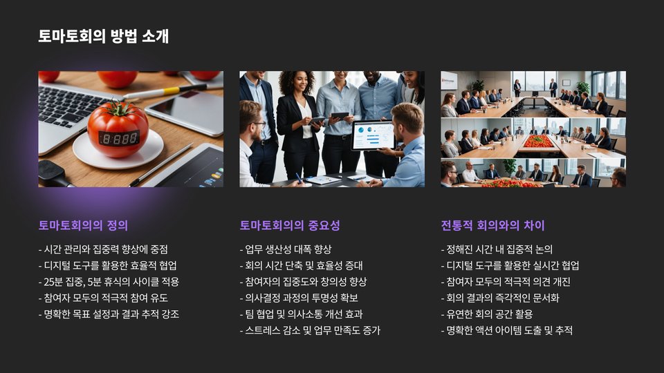 이처럼 효율적인 토마토회의 방법 다섯 가지를 소개하였습니다. 이를 통해 여러분의 회의가 더욱 생산적이고 의미 있는 시간으로 거듭나기를 바랍니다. 다양한 방법을 시도하여 자신에게 가장 잘 맞는 회의 방식을 찾아보세요!