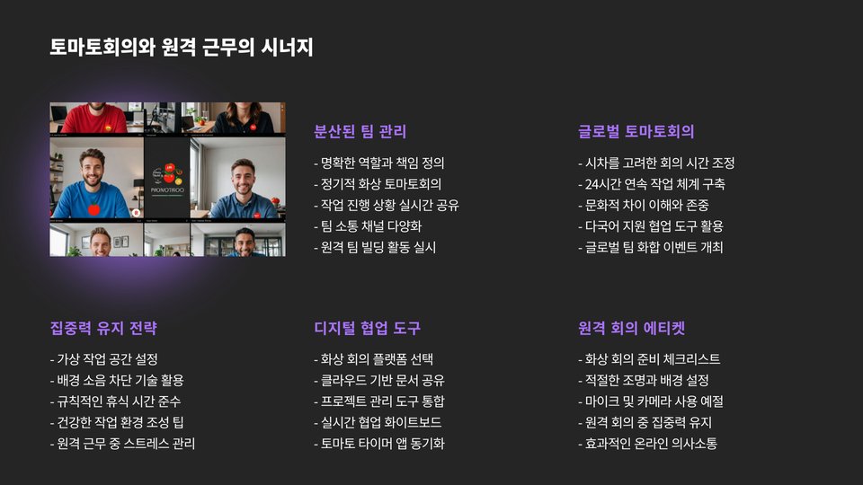 마지막으로, 효율적인 토마토회의를 위해서는 전체 팀의 회의 문화를 개선하기 위한 노력이 필요합니다. 각 참가자는 회의에 적극 참여하고, 의견을 자유롭게 개진할 수 있는 분위기를 조성해야 합니다. 이러한 문화가 조성되면, 회의의 질이 향상되고 팀워크가 강화됩니다.