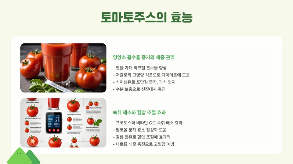 토마토 주스는 신선한 토마토를 갈아서 만든 음료로, 건강에 많은 이점을 제공합니다. 특히, 토마토 주스는 수분 공급이 뛰어나며, 운동 후 피로 회복에도 효과적입니다. 또한, 토마토 주스에는 다량의 비타민과 미네랄이 포함되어 있어 영양가가 높습니다.