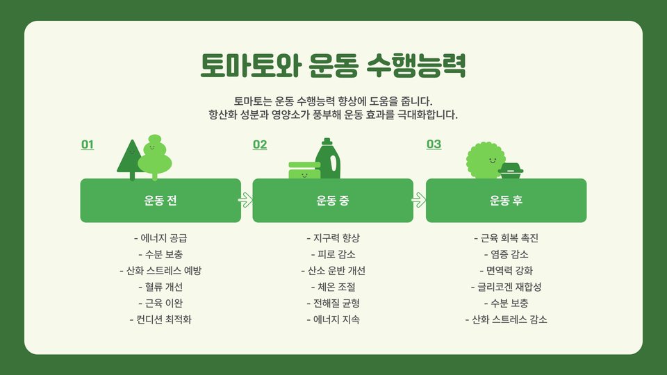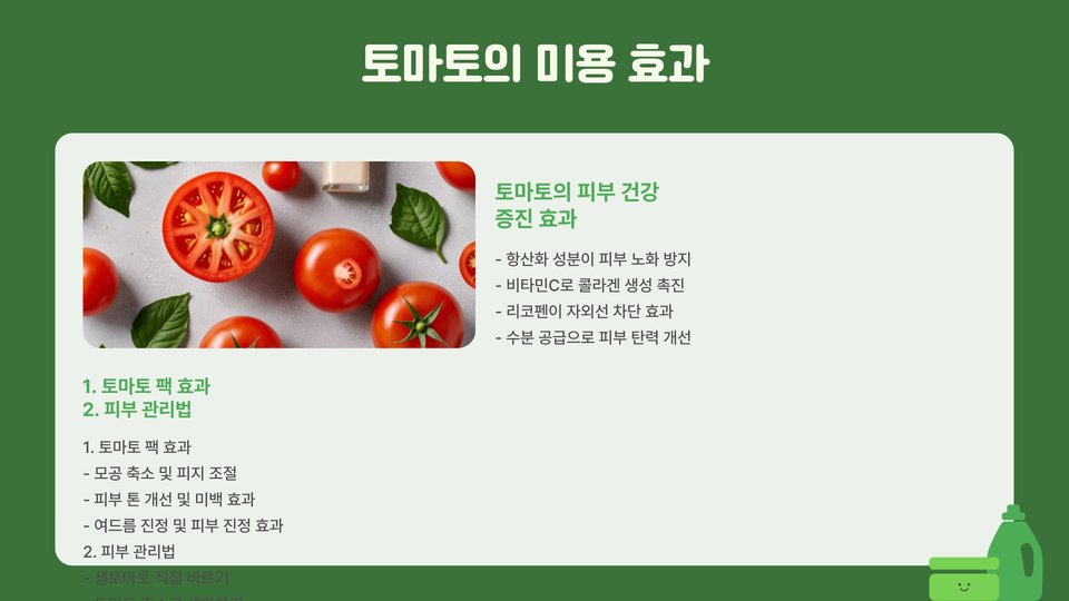 토마토는 비타민 C, 비타민 A, 그리고 칼륨이 풍부하여 면역력을 높이고, 피부 건강을 개선하는 데 도움을 줍니다. 또한, 토마토에 포함된 라이코펜은 강력한 항산화 성분으로, 심혈관 질환과 암 예방에 효과적입니다. 연구에 따르면, 라이코펜은 체내에서 활성산소를 제거하여 세포 손상을 방지합니다.